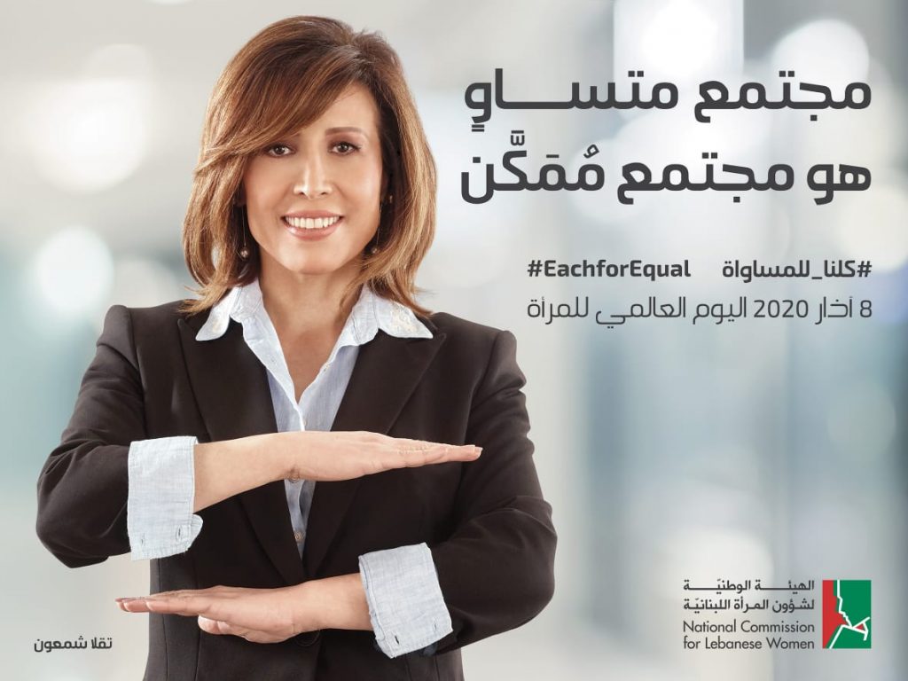 “مجتمع متساوٍ هو مجتمع مُمَكَّن” #كلناللمساواة شعار الهيئة الوطنية لشؤون المرأة اللبنانية بمناسبة اليوم العالمي للمرأة في 8 آذار، بالتعاون مع الممثلة تقلا شمعون. بمناسبة اليوم العالمي للمرأة الذي يصادف في 8 آذار، تنضم الهيئة الوطنية لشؤون المرأة اللبنانية إلى الحملة العالمية التي تحمل شعار #EachforEqual، وتطلق حملة توعوية تحت شعار “مجتمع متساوٍ هو مجتمع مُمَكَّن” #كلناللمساواة. وتتوجه الهيئة الوطنية بالشكر إلى الممثلة القديرة تقلا شمعون التي تعاونت معها في هذا الحملة الرامية إلى إظهار الأثر الإيجابي لتقليص الفجوة في المساواة بين النساء والرجال، على النمو الاقتصادي والاجتماعي في المجتمعات.