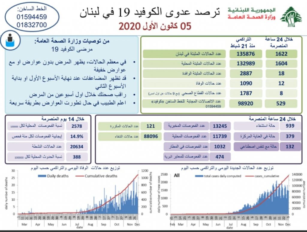 أعلنت وزارة الصحة العامة في لبنان عن تسجيل 1622 إصابة جديدة بفيروس كورونا المستجد “كوفيد 19” منهم 1604 حالة تعود لمحليين و18 لوافدين، توازياً مع تسجيل 12 حالة وفاة خلال الساعات الـ 24 الأخيرة.