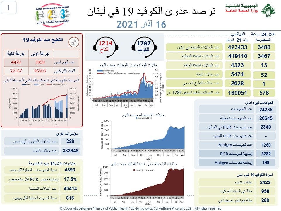 أعلنت وزارة الصحة العامة في لبنان عن تسجيل 3480 إصابة جديدة بفيروس كورونا ليرتفع العدد التراكمي للإصابات منذ بدء انتشار الوباء إلى 423433. كما وسجل لبنان 52 حالة وفاة ما رفع العدد التراكمي للوفيات إلى 5474.