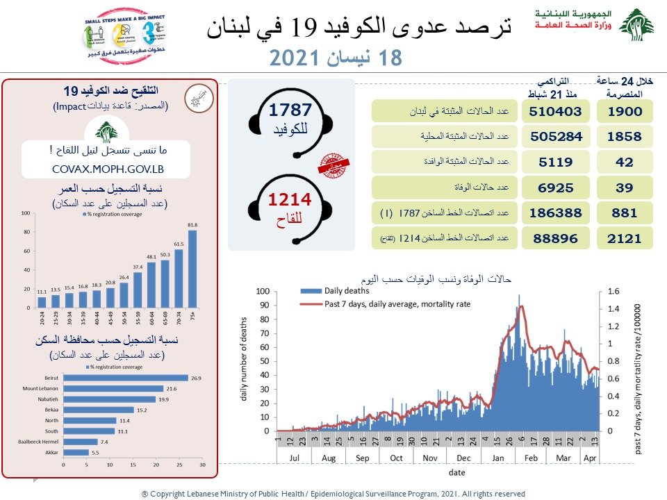 اعلنت وزارة الصحة العامة في لبنان تسجيل 1900 اصابة جديدة رفعت العدد التراكمي للحالات المثبتة الى 510403، كما تم تسجيل 42 حالة وفاة.