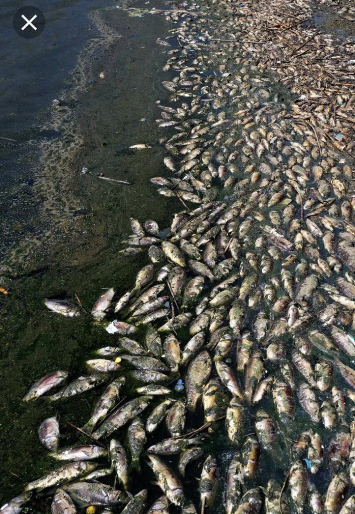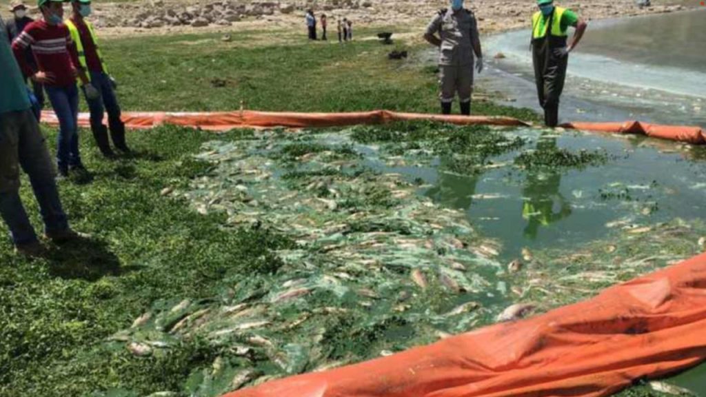 نفوق أطنان من الأسماك في بحيرة القرعون الملوثة في لبنان.