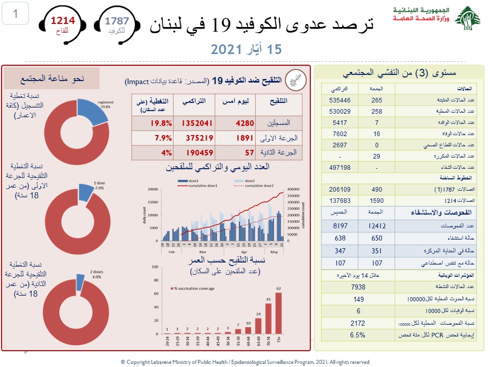 اعلنت وزارة الصحة العامة في لبنان تسجيل 265 إصابة جديدة رفعت العدد التراكمي للحالات المثبتة الى 535446 ، كما تم تسجيل 16 حالة وفاة.