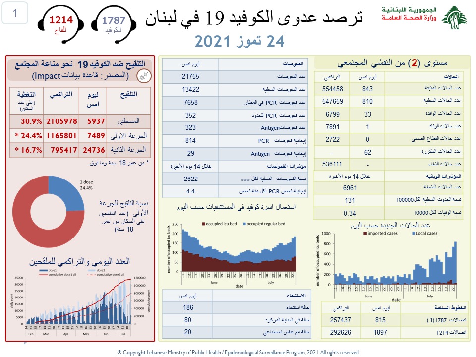 أعلنت وزارة الصحة العامة اللبنانية في تقريرها اليومي تسجيل 843 إصابة جديدة بفيروس كورونا رفعت العدد التراكمي للحالات المثبتة الى 554458، كما تم تسجيل حالة وفاة.