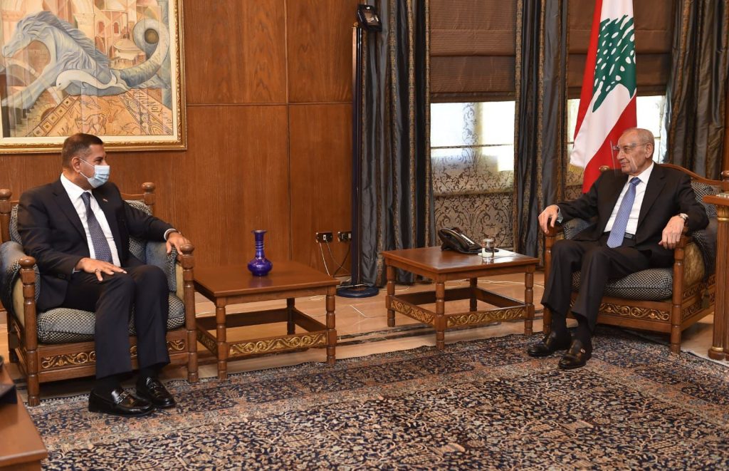 بعدها قال السفير البراك : تشرفنا اليوم بزيارة دولة رئيس مجلس النواب الاستاذ نبيه بري وتباحثنا في العلاقات الثنائية بين البلدين الشقيقين من مختلف الجوانب السياسية والاقتصادية أيضاً قدمنا لدولته شرحاً عن العملية الانتخابية المزمع اجراؤها في العراق في العاشر من الشهر الجاري وسأل دولته عن تفاصيل العملية واشاد دولته بالجهود التي تبذلها الحكومة العراقية والمفوضية العليا لتأمين الانتخابات المهمة في تاريخ العراق الحديث وأيضاً قدم دولته مشكوراً شرحاً مفصلاً عن العملية السياسية في لبنان وتمنينا له وللحكومة وللشعب اللبناني التوفيق والنجاح وللبرامج الوزاري المزمع تنفيذه النجاح والازدهار .