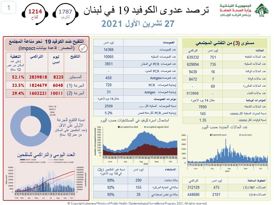 أعلنت وزارة الصحة العامة في تقريرها اليومي تسجيل 751 إصابة جديدة بفيروس كورونا رفعت العدد التراكمي للحالات المثبتة الى 639332، كما تم تسجيل 7 حالات وفاة.
