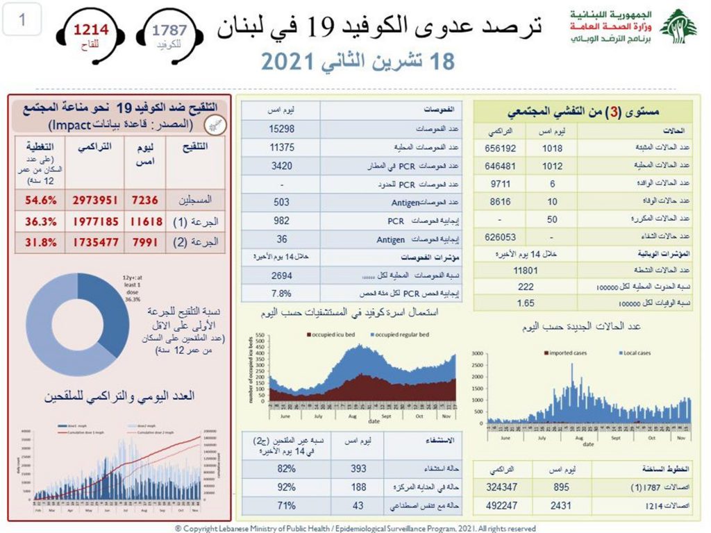 أعلنت وزارة الصحة العامة اللبنانية في تقريرها اليومي تسجيل 1018 إصابة جديدة بفيروس كورونا رفعت العدد التراكمي للحالات المثبتة الى 656192، كما تم تسجيل 10 حالات وفاة .