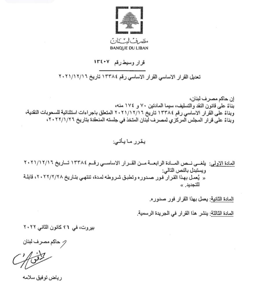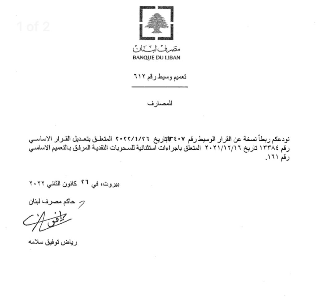 ولهذه الغاية، أصدر الحاكم سلامة تعميماً وسيطاً حمل الرقم 612 تاريخ 26-1-2022…