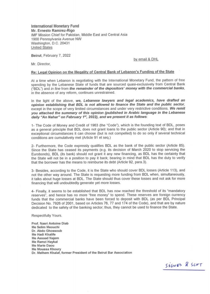 بتاريخ ٢٠٢٢/٢/٧، أرسل المحامون البروفسور نصري أنطوان دياب، والاستاذ سليم المعوشي، والاستاذ رمزي هيكل، والدكتور عبده جميل غصوب، والاستاذ هادي خليفه، والاستاذ أسعد نجم، والاستاذة ماري ضو، والاستاذ موسى خوري، والنقيب السابق الدكتور ملحم خلف، كتاباً الى صندوق النقد الدولي (IMF) بشخص المدير ورئيس البعثة في منطقة الشرق الأوسطErnesto Ramirez-Rigo،
