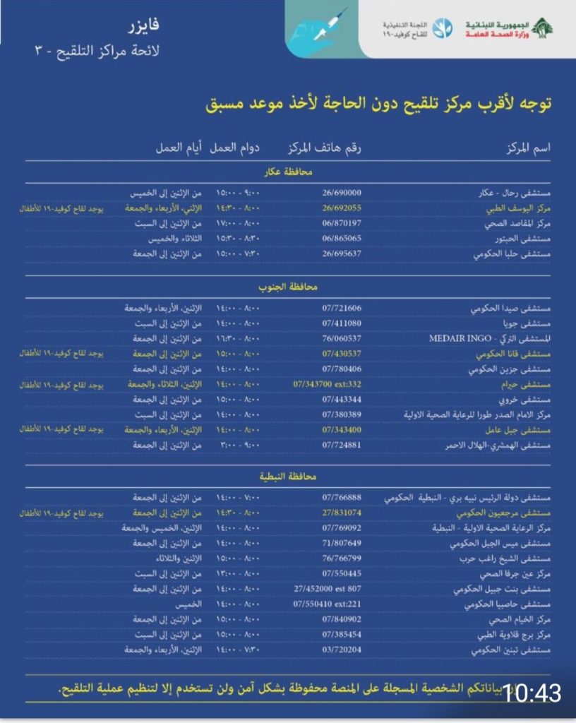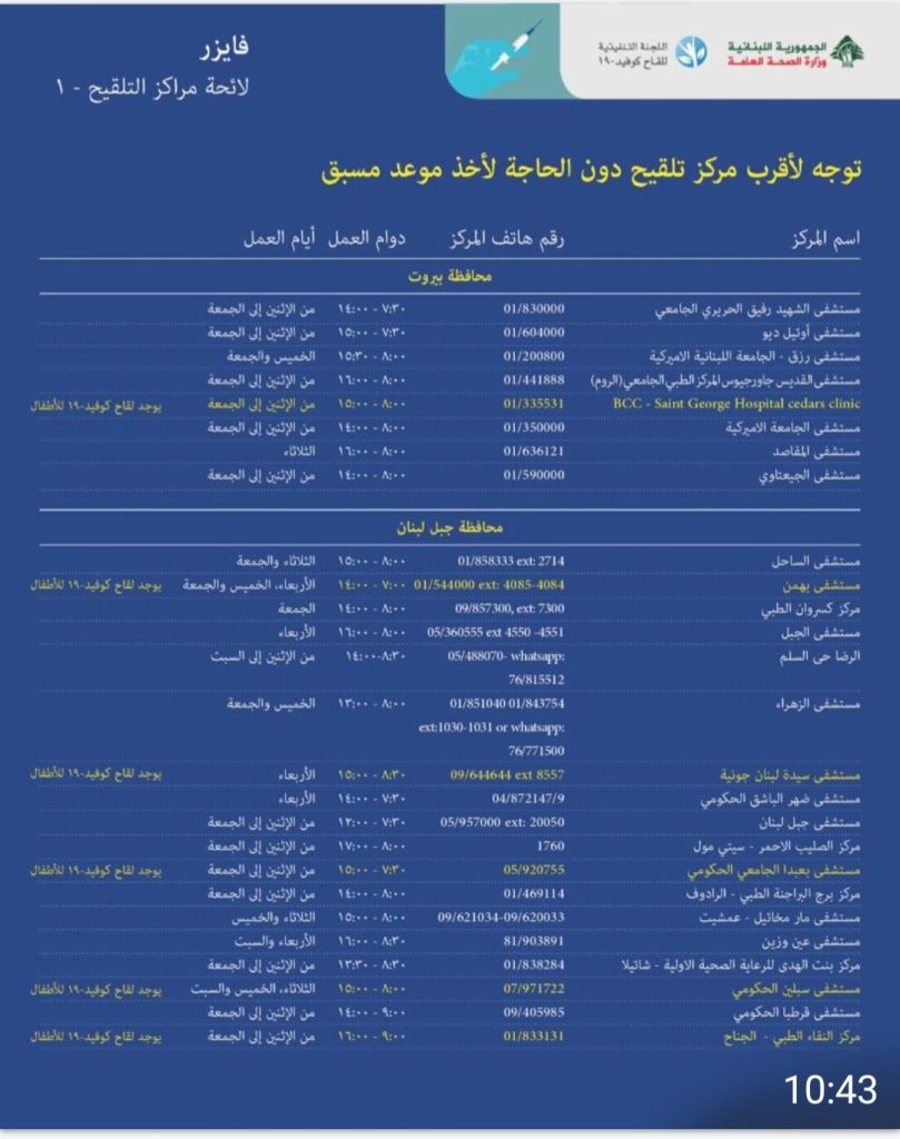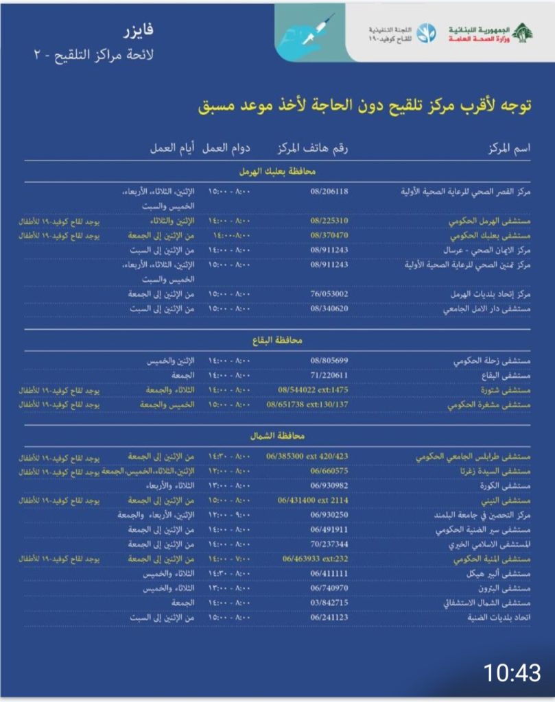 – يمكن أخذ اللقاح مجاناً، وبغض النظر عن الجرعة (الاولى، أو الثانية، او الثالثة، أو الرابعة) في أيّ من مراكز اللقاح الموزعة على الاراضي اللبنانية كافة، من دون موعد مسبق طيلة أيام الاسبوع.
