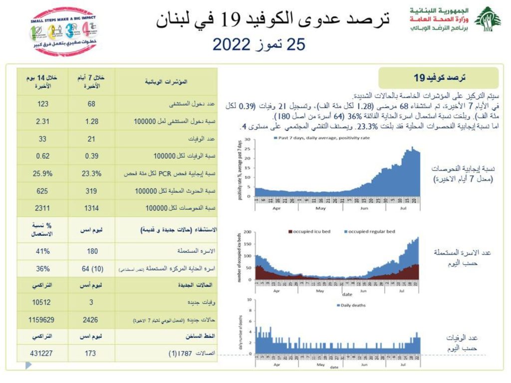 أعلنت وزارة الصحة اللبنانية الاثنين انه تم تسجيل 3 وفيات و2426 إصابة جديدة بفيروس كورونا خلال الـ24 ساعة الماضية.