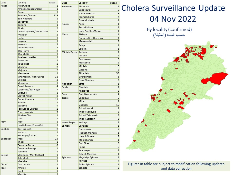 اعلنت وزارة الصحة العامة في تقرير نشرته مساء اليوم عن حالات الكوليرا في لبنان تسجيل “3 اصابات جديدة رفعت العدد التراكمي إلى 416، فيما لم يتم تسجيل اي حالة وفاة وسجل العدد التراكمي للوفيات 18”.