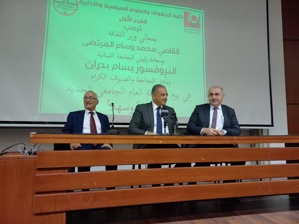 ومما جاء في كلمة الوزير المرتضى: “تجيء بي إلى ههنا أشواق عمر جميل قضيته طالبا للحقوق في الفرع الأول من الجامعة اللبنانية، زمان كان مقره في الصنائع حيث تقوم الآن المكتبة الوطنية ومكتب لوزير الثقافة. وتنتابني المشاعر نفسها التي تخفق اليوم في قلوب الطلاب المقبلين على عام جديد من الدرس والبحث في طوايا الكتب والمراجع والمصنفات، ومن السكنى في جيرة القوانين والاجتهادات. ويعود إلي ما يجول هذه اللحظة في خواطر طلاب السنة الأخيرة الذين بات لكل واحد منهم شأن ابن الملوح القائل: