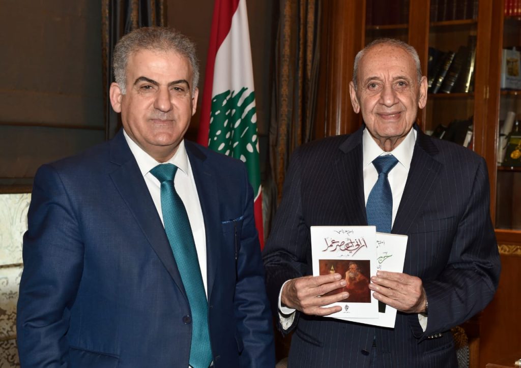 وبعد الظهر استقبل الرئيس بري رئيس الحركة الثقافية في لبنان باسم عباس الذي قدم لرئيس المجلس آخر إصدارين له وهما ديوانان من الشعر الاول “خرير الدهر” مهدى الى فلسطين والثاني ديوان ” أراني اعصر عمراً”