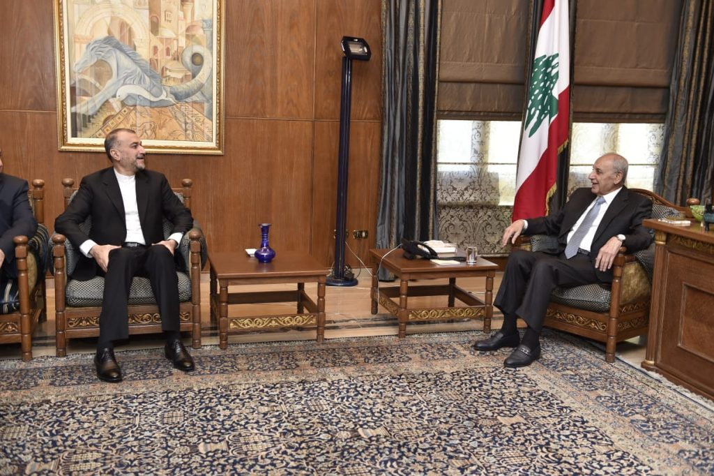 استقبل رئيس مجلس النواب الاستاذ نبيه بري في مقر الرئاسة الثانية في عين التينة وزير خارجية الجمهورية الاسلامية الايرانية حسين أمير عبد اللهيان والوفد المرافق بحضور السفير الإيراني لدى لبنان مجتبى أماني اللقاء الذي استمر زهاء الساعة جرى خلاله عرض للأوضاع العامة في لبنان والمنطقة والعلاقات الثنائية بين البلدين غادر بعدها عبد اللهيان دون الإدلاء بتصريح .