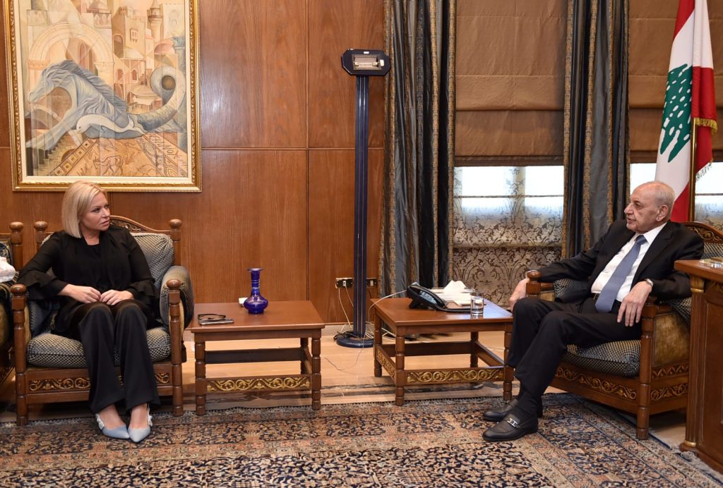 الرئيس بري استقبل أيضاً المنسقة الخاصة للأمم المتحدة في لبنان جينين هينيس بلاسخارت (Jeanine Hennis-Plasschaert) حيث جرى عرض للأوضاع العامة في لبنان والمنطقة لاسيما السياسية والميدانية منها على ضوء تصاعد العدوان الإسرائيلي على لبنان .