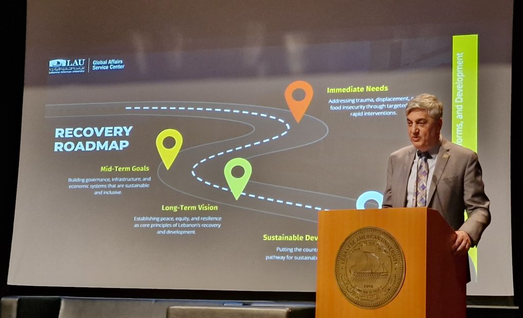نظم “مركز خدمات الشؤون الدولية (Global Affairs Service Center)” في الجامعة اللبنانية الاميركية (LAU) ندوة في حرم جبيل لـ “فريق العمل الاستشاري للتعافي، الإصلاحات، والتنمية” في المركز تحت عنوان “دعم تعافي لبنان بعد الحرب من خلال الخبرة المتعددة التخصص”، شاركت فيها مجموعة من أهم المؤسسات الدولية العاملة في لبنان مثل: (UNDP)، و”منظمة الاغذية العالمية (FAO)”،(ICRC)،(ICU)،(International Medical Corps)، (International Orthodox Christian Charities) ، “اليونيسف”، “منظمة الصحة العالمية” الى جانب خبراء محليين ومن جامعة (LAU).