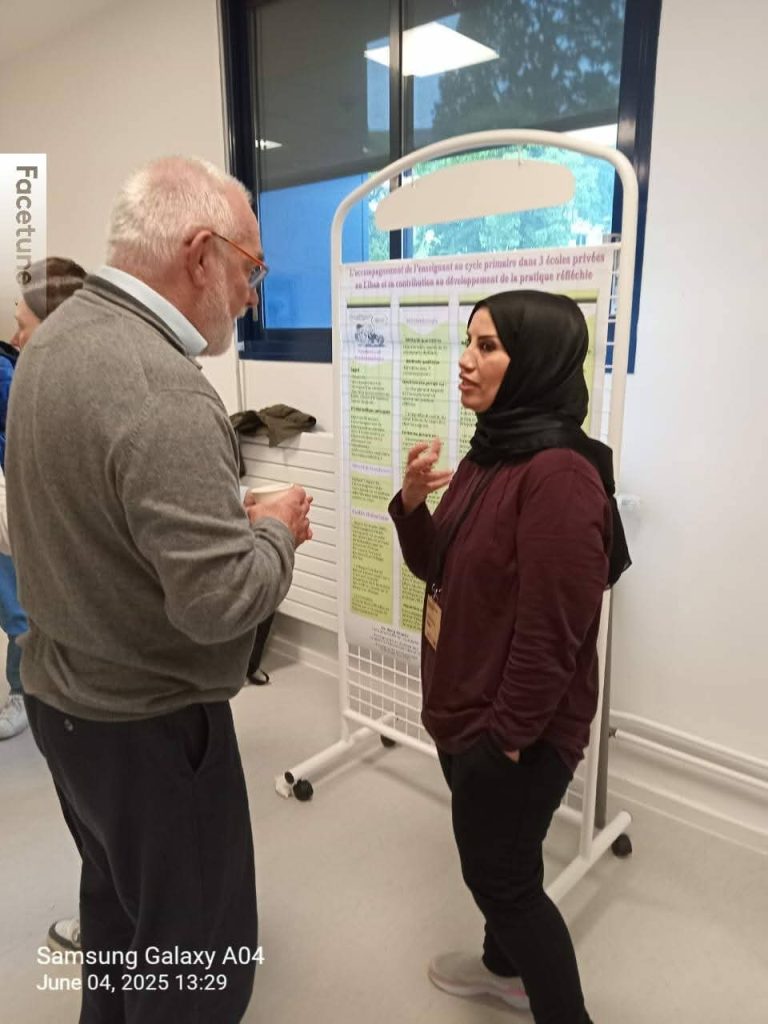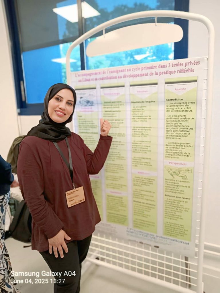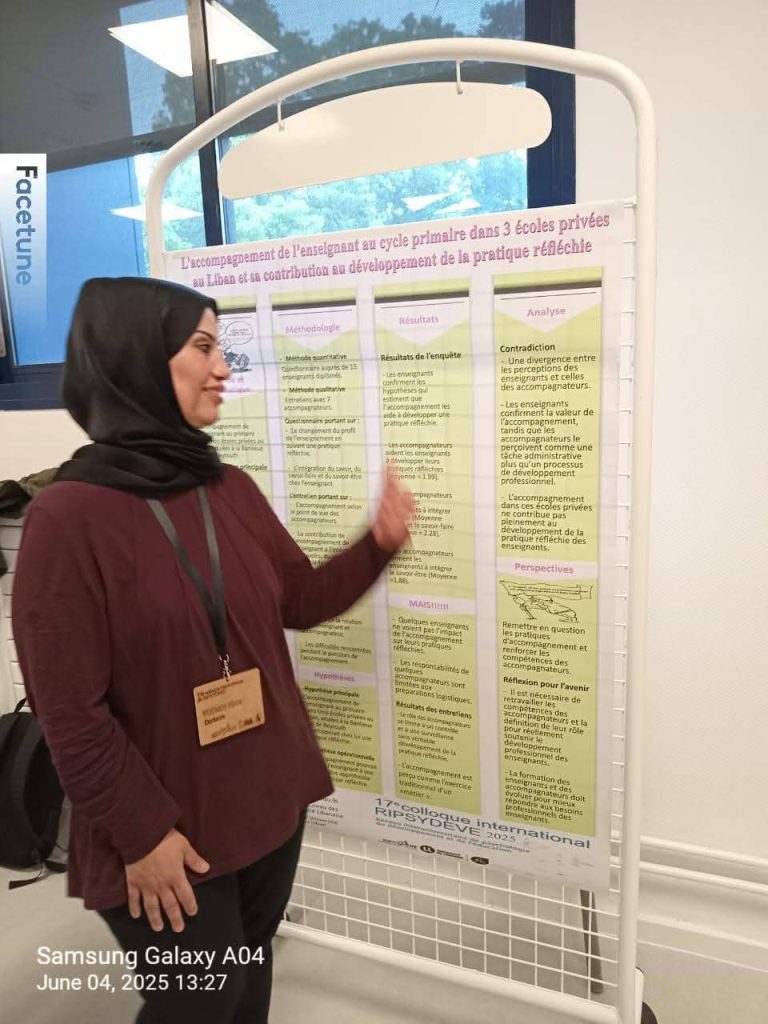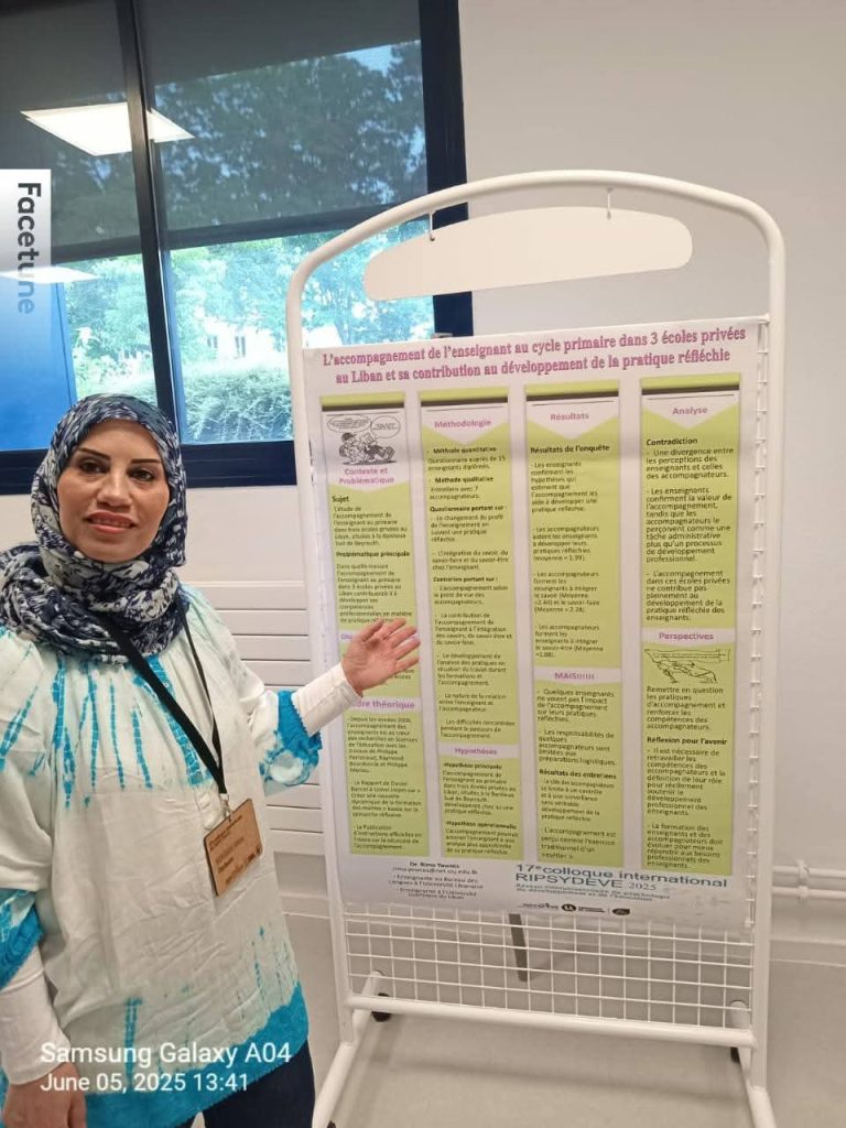La contribution de la Dre Younes a pris la forme d’une communication affichée intitulée : “L’accompagnement de l’enseignant au cycle primaire dans trois écoles privées au Liban et sa contribution au développement de la pratique réfléchie chez lui”. Cette recherche s’inscrit dans une volonté de sortir du cadre traditionnel du rôle de l’accompagnateur pédagogique, en mettant en lumière son impact sur l’enrichissement des pratiques professionnelles des enseignants dans le primaire.