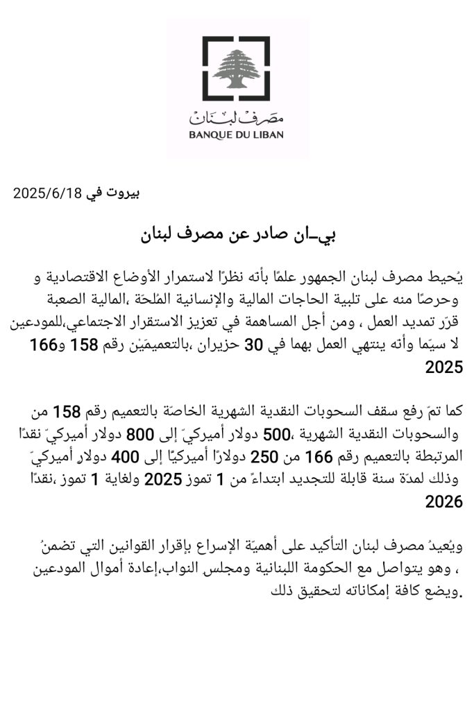 واضاف البيان انه “تم رفع سقف السحوبات النقدية الشهرية الخاصة بالتعميم رقم 158 من 500 دولار أميركيّ إلى 800 دولار أميركيّ نقدًا والسحوبات النقدية الشهرية المرتبطة بالتعميم رقم 166 من 250 دولارًا أميركيًّا إلى 400 دولارٍ أميركيّ نقدًا، وذلك لمدّة سنة قابلة للتجديد ابتداءً من 1 تموز 2025 ولغاية 1 تموز 2026”.