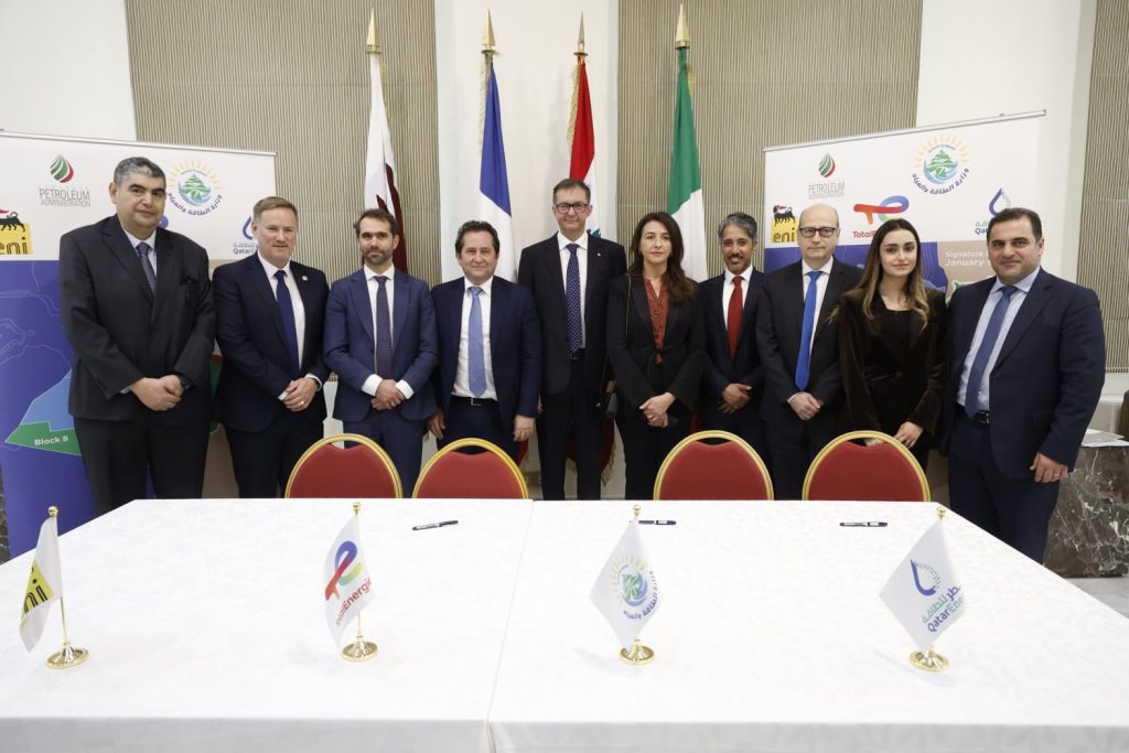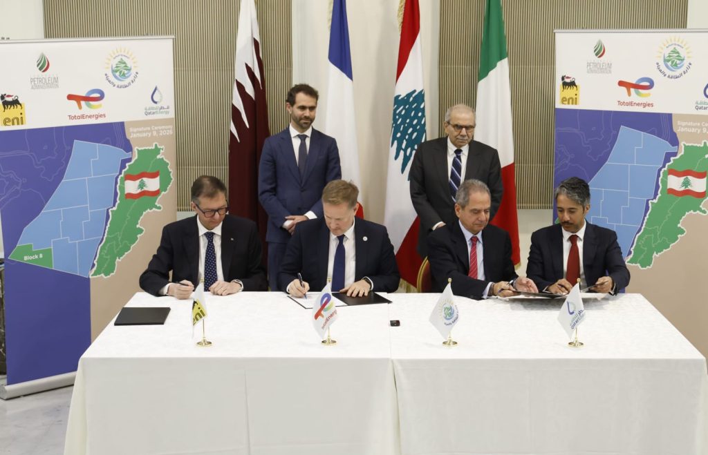 باريس، 9 كانون الثاني 2026 – وقّعت شركة توتال إنرجيز (35%، المشغّل) وشركاؤها إيني (35%) وقطر للطاقة (30%) إتفاقيّة مع السلطات اللبنانيّة لدخول رخصة الإستكشاف للبلوك 8 في المياه البحريّة اللبنانيّة.
