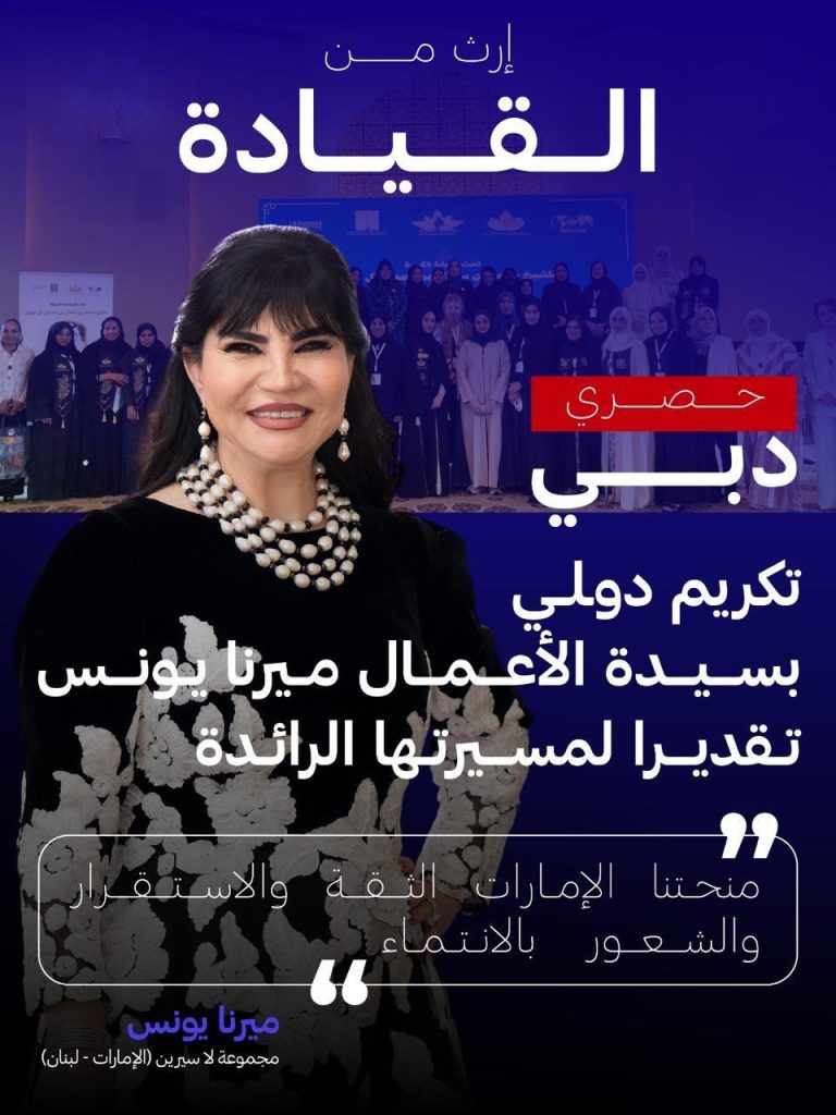 شهد المؤتمر الدولي الثاني لرائدات الأعمال، الذي نظمته جمعية الإمارات لرائدات الأعمال بالتعاون مع مجلس سيدات أعمال العرب، تكريم سيدة الأعمال ميرنا يونس، وذلك تقديراً لجهودها الملموسة في تمكين المرأة ودورها الريادي في دعم التنمية الاقتصادية.