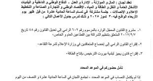 دعا رئيس مجلس النواب الاستاذ نبيه بري لجان ، المال والموازنة الإدارة والعدل ، الدفاع الوطني والداخلية والبلديات ، الاشغال العامة والنقل والطاقة والمياه الاقتصاد الوطني والتجارة والصناعة والتخطيط ، الإعلام والإتصالات الى جلسة مشتركه في تمام الساعه 11 من قبل ظهر يوم الاربعاء الواقع فيه 30 تموز 2025 وذلك …