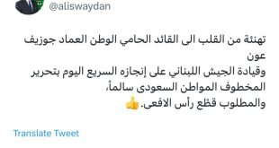 غرد الحاج علي سويدان على صفحته على وسائل التواصل الاجتماعي مهنئا قيادة الجيش ومديرية المخابرات على انجازهم السريع في تحرير المخطوف السعودي في عملية سريعة ونوعيةوكتب في تغريدته: “تهنئة من القلب الى القائد الحامي للوطن العماد جوزاف عون وقيادة الجيش اللبناني على إنجازه السريع اليوم بتحرير المواطن السعودي سالما “. …