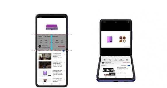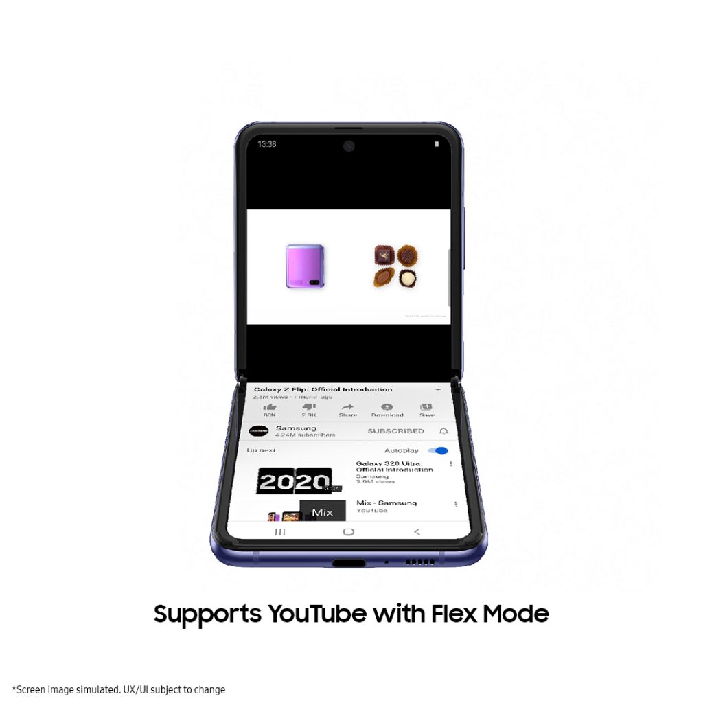 عملت سامسونح عن كثب مع جوجل لتصميم الوضعية المرنة للجهاز – والتي توفر تجربة استخدام مخصصة لعامل الشكل الأمامي القابل للطي في هاتف Galaxy Z Flip. فعندما يكون الجهاز قائمًا بذاته، تنقسم الشاشة تلقائياً إلى شاشتين مقاس كل منها 4 بوصات ليتمكن المستخدم من عرض الصور أو المحتويات أو مقاطع الفيديو في النصف العلوي من الشاشة بشكل سلس، والتحكم فيها في النصف السفلي. وقد بات بإمكان المستخدمين بفضل هذا التعاون، مشاهدة فيديوهات YouTube والتنقل بينها بسهولة – عبر تشغيل الفيديوهات في الجزء العلوي والبحث عن مقاطع فيديو أخرى، وقراءة الأوصاف وكتابة التعليقات في الأسفل.