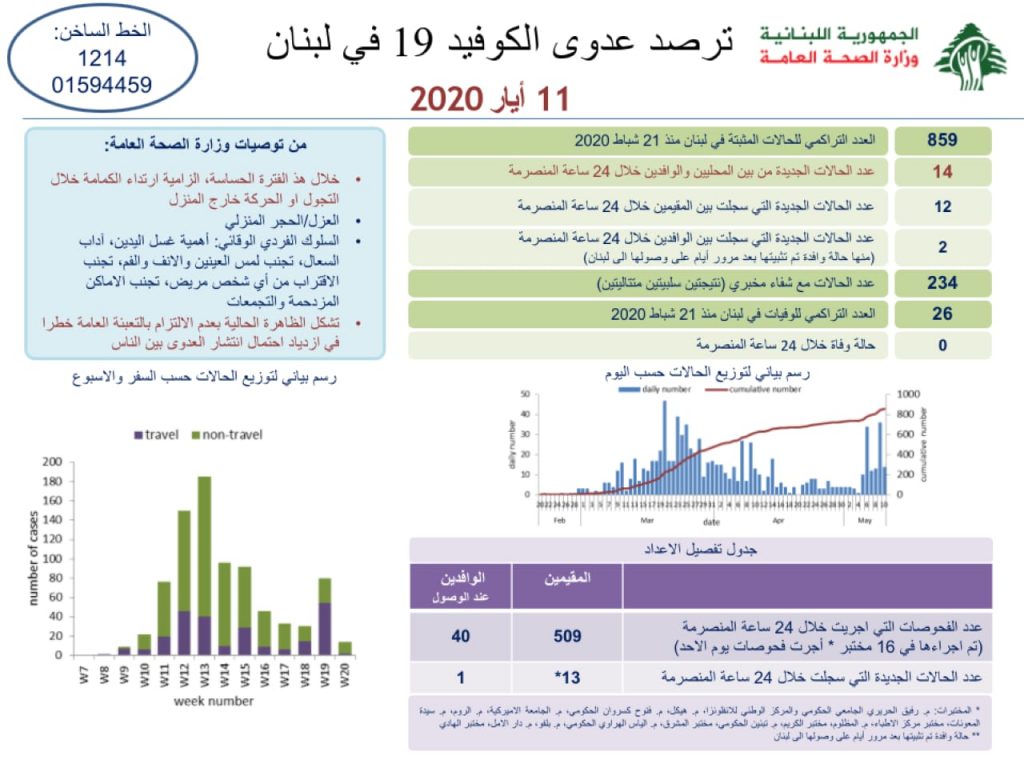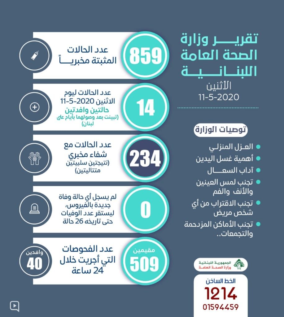 تضمن تقرير وزارة الصحة اللبنانية ١٤ اصابة جديدية بفيروس كورونا توزعت بين ١٢ للمقيمين و اصابتين من بين الوفدين ليرتفع العدد الاجمالي الى ٨٥٩ اصابة