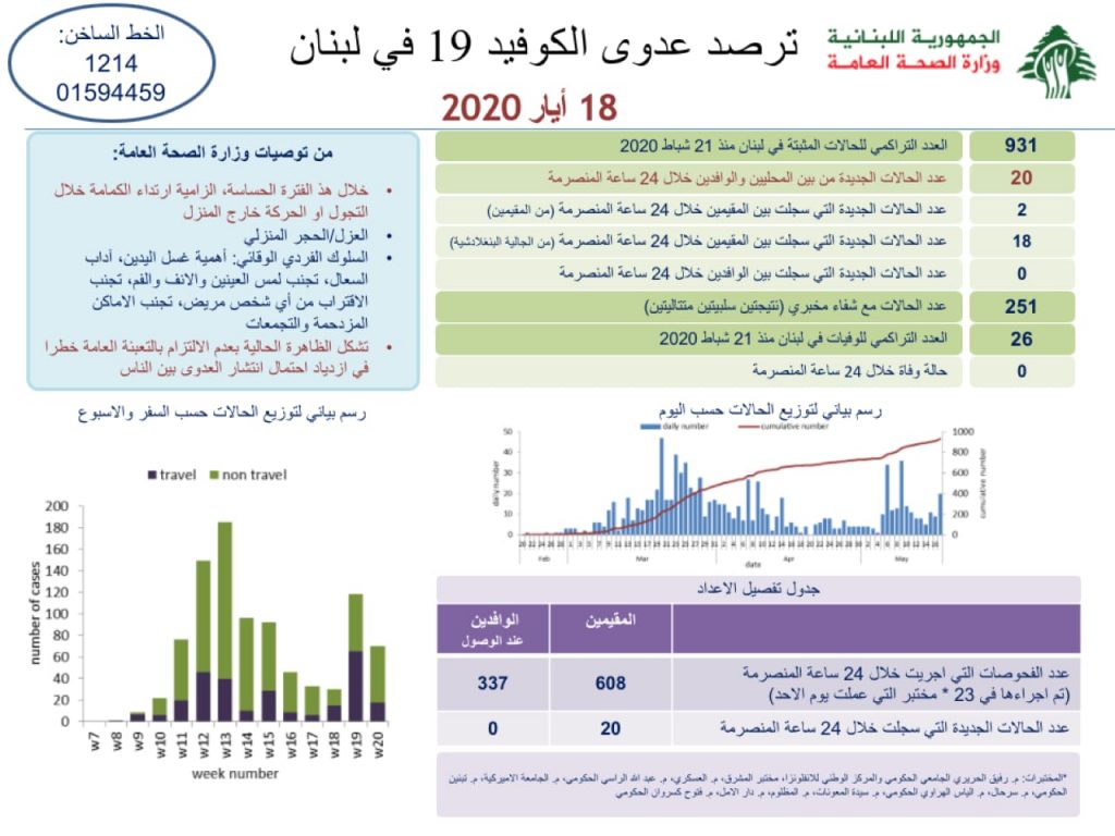أعلنت وزارة الصحة العامة في لبنان تسجيل 20 اصابة جديدة بوباء كورونا، ما يرفع العدد التراكمي للحالات المثبتة الى 931.