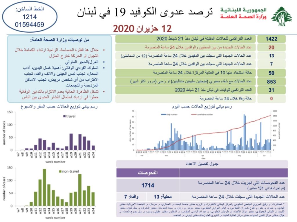 اعلنت وزارة الصحة العامة في لبنان تسجيل 20 اصابة كورونا جديدة 13 من المقيمين و7من الوافدين رفعت العدد التراكمي للحالات المثبتة الى 1422.