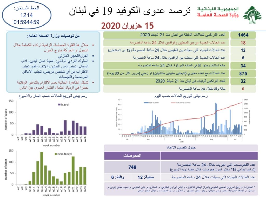 أعلنت وزارة الصحة العامة في لبنان تسجيل 18 إصابات كورونا جديدة، ما يرفع العدد التراكمي للحالات المثبتة الى 1464.