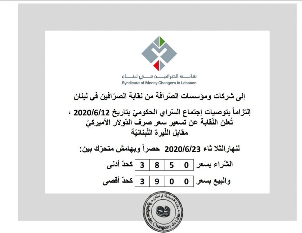 أعلنت نقابة الصرافين في لبنان تسعير سعر صرف الدولار الأميركي مقابل الليرة اللبنانية ليوم الثلاثاء 23-06-2020 حصرا وبهامش متحرك بين: الشراء بسعر 3850 حدا أدنى، والبيع بسعر 3900 حد أقصى.