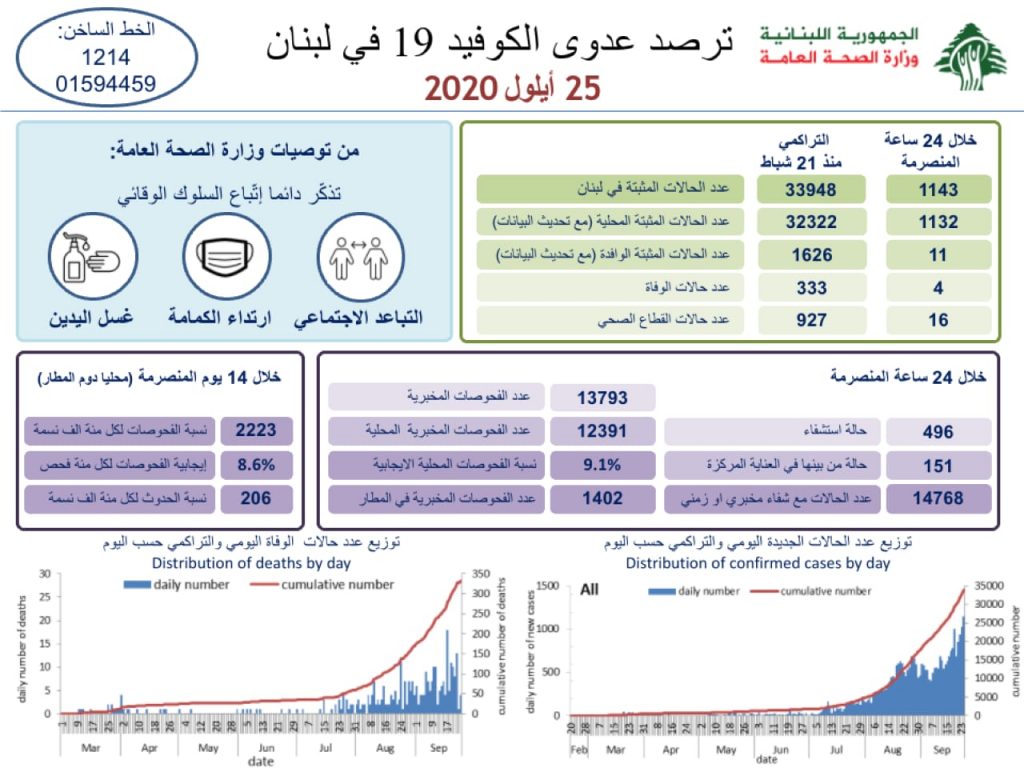 أعلنت وزارة الصحة العامة في لبنان تسجيل 1143 اصابة كورونا جديدة رفعت العدد التراكمي منذ 21 شباط الماضي الى 33962 حالة.