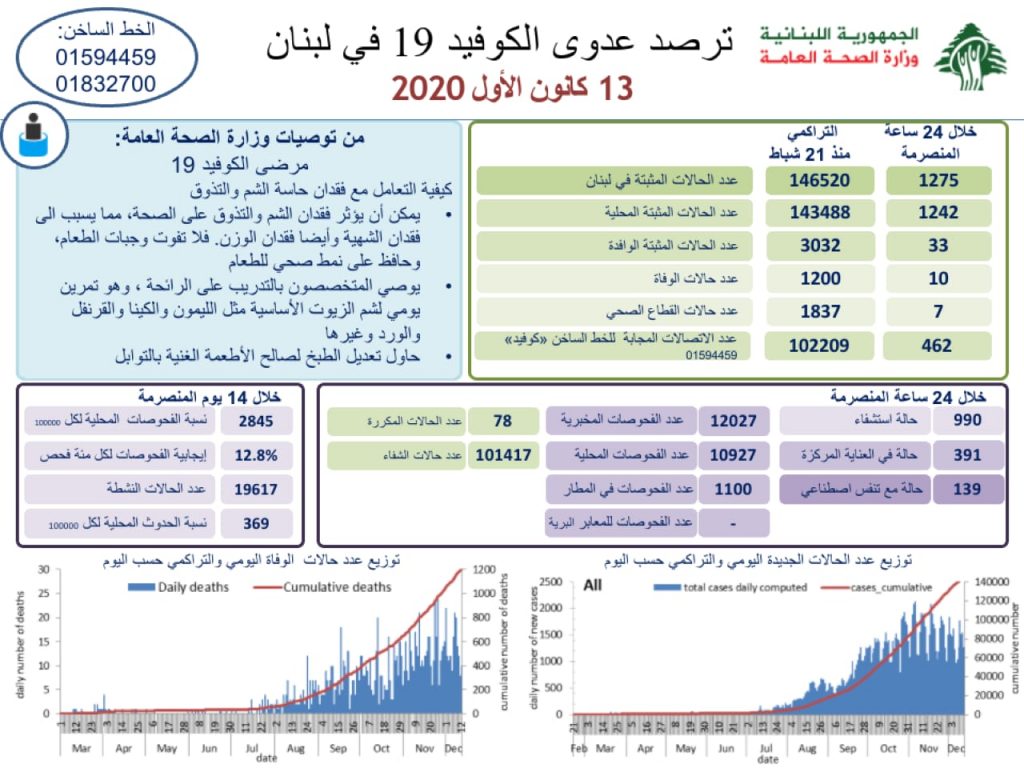 اعلنت وزارة الصحة العامة في لبنان تسجيل 1275 اصابة كورونا جديدة رفعت العدد التراكمي للحالات المثبتة ال 146520. كما تم تسجيل 10 حالات وفاة