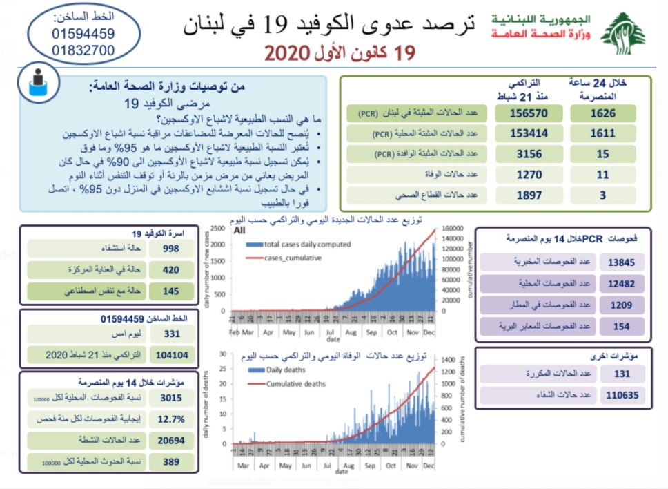 اعلنت وزارة الصحة العامة في لبنان تسجيل 1626 اصابة كورونا جديدة رفعت العدد التراكمي للحالات المثبتة ال 156570. كما تم تسجيل 11 حالة وفاة.