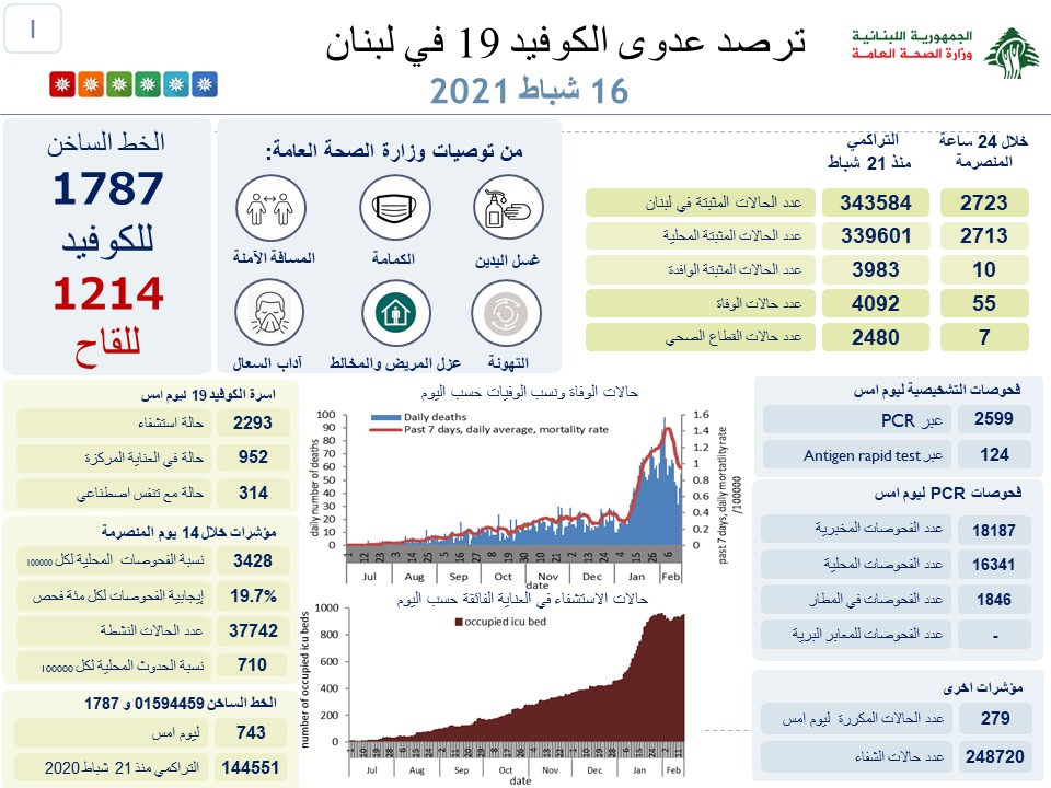 اعلنت وزارة الصحة العامة في لبنان تسجيل 2723 اصابة جديدة رفعت العدد التراكمي للحالات المثبتة الى 343584. كما تم تسجيل 55 حالة وفاة.