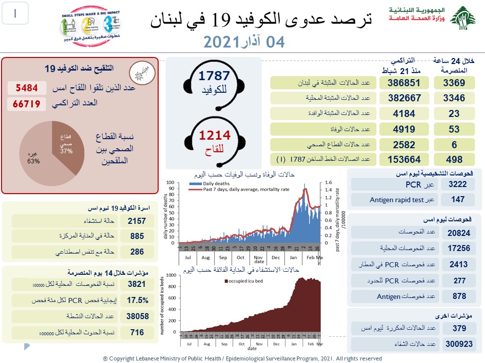 علنت وزارة الصحة العامة في لبنان تسجيل 3369 اصابة جديدة رفعت العدد التراكمي للحالات المثبتة الى 386851. كما تم تسجيل 53 حالة وفاة.