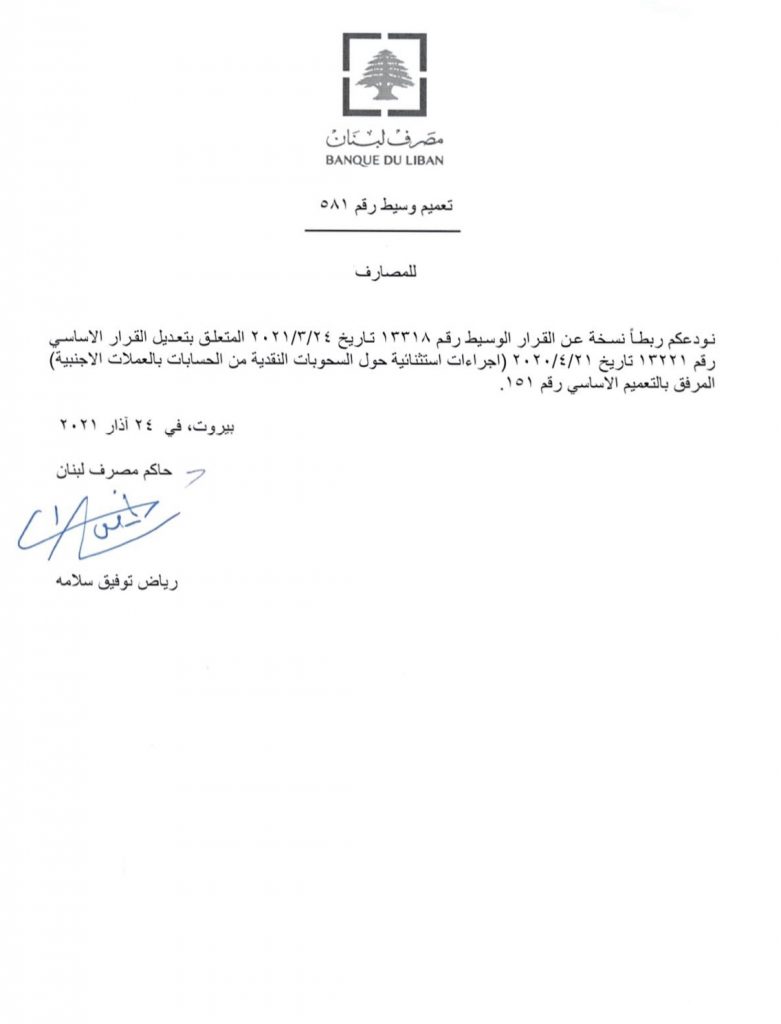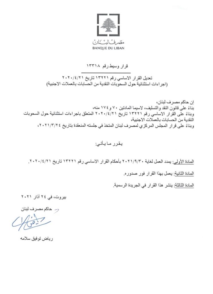 أصدر مصرف لبنان تعميما يقضي بتمديد القرار الاساسي رقم 13221 المتعلق بالإجراءات الاستثنائية بشأن السحوبات النقدية من الحسابات بالعملات الاجنبية لغاية 30 أيلول المقبل.