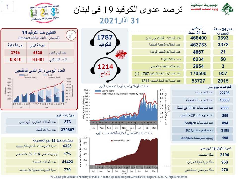 اعلنت وزارة الصحة العامة في لبنان تسجيل 3393 اصابة جديدة رفعت العدد التراكمي للحالات المثبتة الى 468400، كما تم تسجيل 50 حالة وفاة.