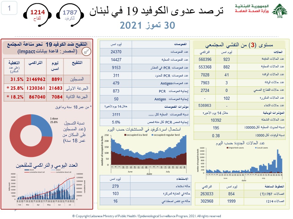 أعلنت وزارة الصحة العامة اللبنانية في تقريرها اليومي تسجيل 923 إصابة جديدة بفيروس كورونا رفعت العدد التراكمي للحالات المثبتة الى 560396، كما تم تسجيل 3 حالات وفاة.