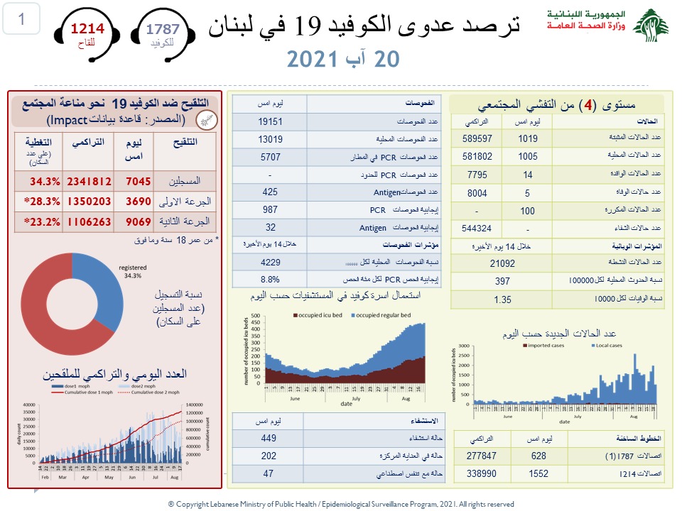 أعلنت وزارة الصحة العامة اللبنانية في تقريرها اليومي تسجيل 1019 إصابة جديدة بفيروس كورونا رفعت العدد التراكمي للحالات المثبتة الى 589597، كما تم تسجيل 5 حالات وفاة.