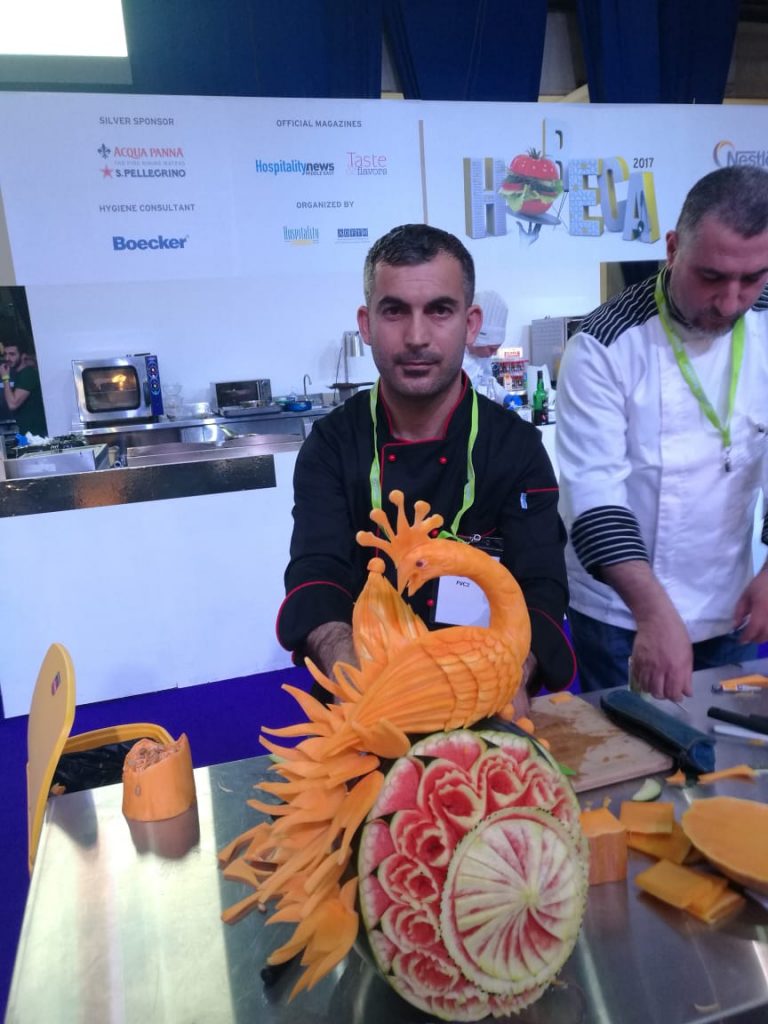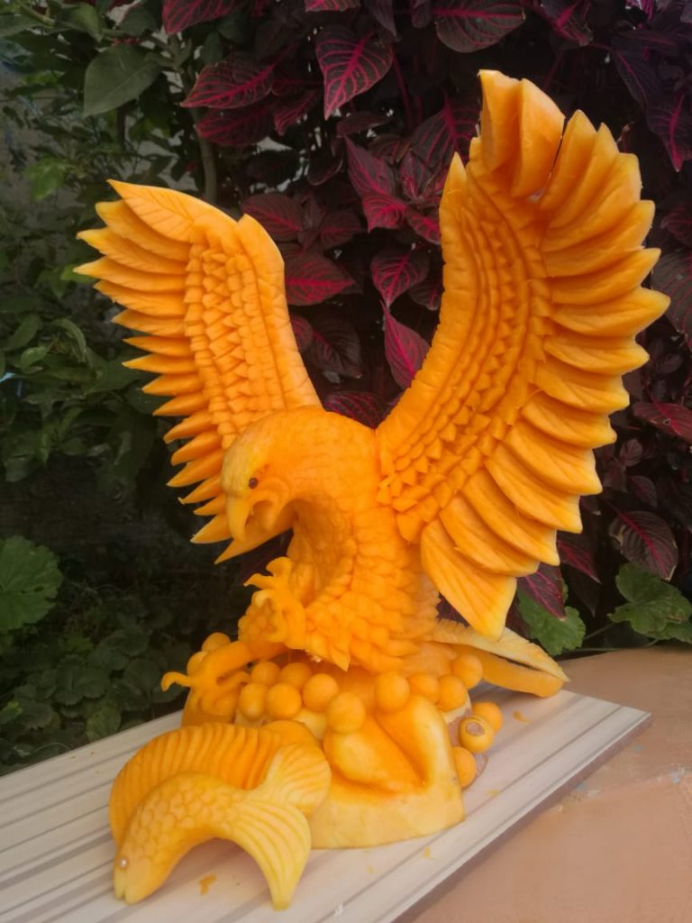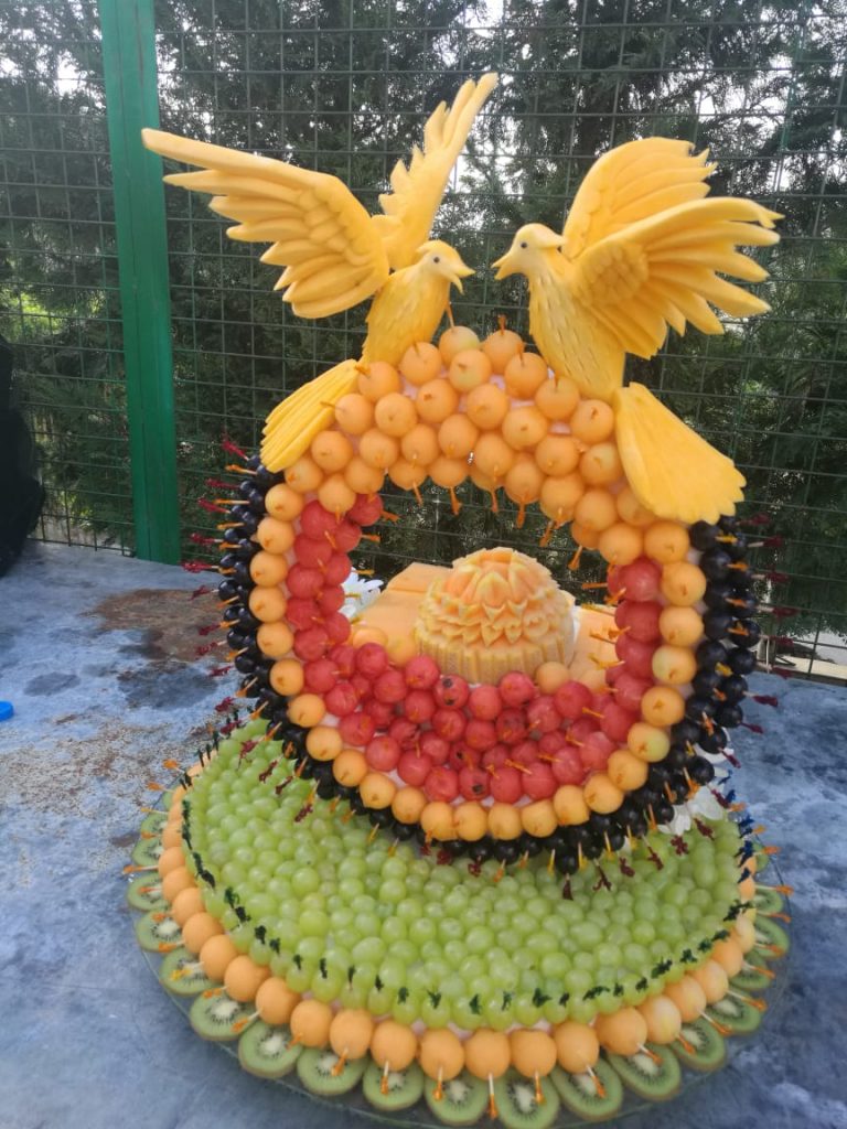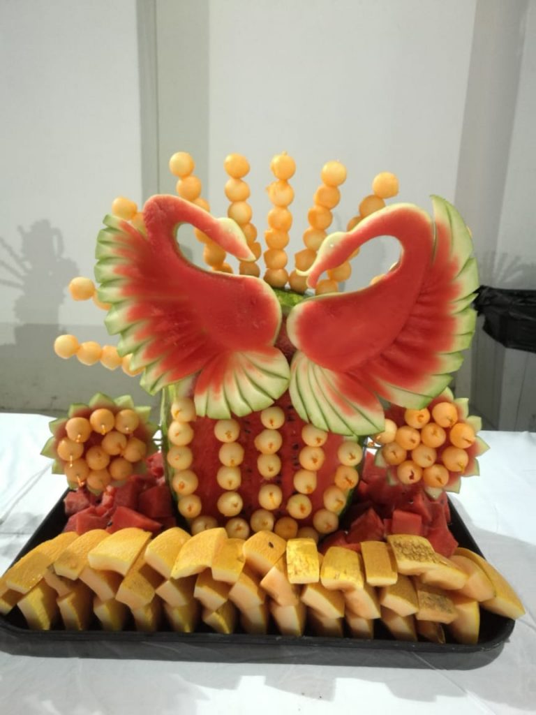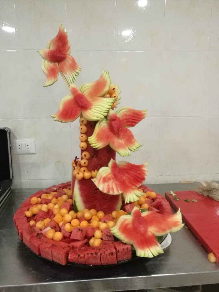 ولفتت أعمالي تلك إدارة ومسؤولي الفندق، فبدأوا يعتمدون عليّ في عملية التزيين للاحتفالات ومناسبات الأفراح التي تقام في الفندق كما لدى افتتاح محال تجارية او صالونات حلاقة بحفر ما يلزم من مجسمات وصور العرسان وورود وأسماك وحيوانات بحرية وطيور وشمع وغير ذلك على الفواكهة وتحديداً البطيخ والشمام واللقطين، إلى حين بعد عشر سنوات على مزاولتي العمل في المطاعم واحترافي مهنة الحفر على الفواكهة تزامن مع تخرجي من دار المعلمين كأستاذ لمادة الرياضة ومتابعتي تحصيل الدكتوراه في مادة الجغرافيا عندها تخليت عن عملي في قطاع المطاعم وأستقليت متفرغاً لهذا الفن بإنشاء محترف خاص في منزلي أمارس أعمالي ونشاطاتي من خلاله إضافة لمهنة التعليم وبات لي رصيد كبير من الشهرة والعلاقات العامة ومقصداً لكثيرين مِمَنْ يرغبون بإنجاز لهم فنون حفر على أنواع الفواكهة لتتزيين بها مآدب المناسبات على أنواعها وبعض المواطنين يختارون بأنفسهم المطلوب حسب المناسبة، خاصة أعياد الميلاد وما تتطلب من رسومات محددة أكانت لصاحب المناسبة أم صورة من وحيها وشخصياً أمتهن مهنة الرسم، إضافة إلى الحفر والبعض يترك لي الخيار بما يتناسب والمناسبة وما أود الإشارة إليه لم أنتسب إلى إي معهد لهذه المهنة أو الحرفة الإتكال على ذاتي وبنات أفكاري والذوق والدفة ومواكبة التطور وعمله دقيق جداً لا يتحمل أي خطأ.
