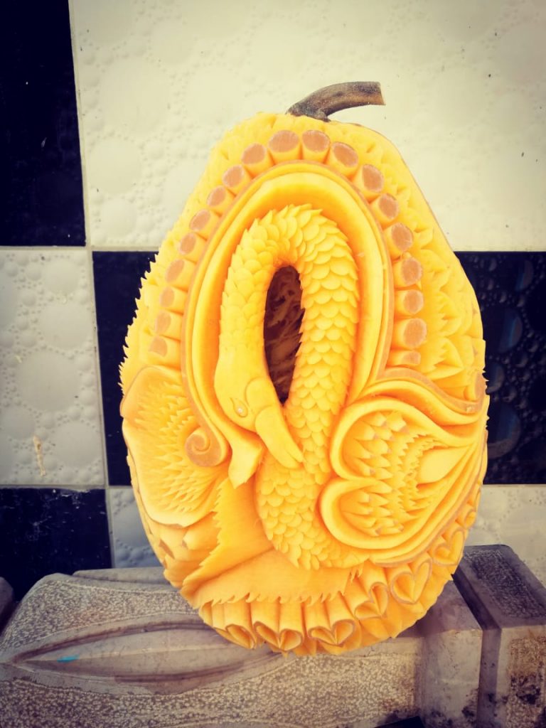 - بداية وبعمر عشرين سنة كانت الإنطلاقة الأولى من على مقاعد الدراسة الجامعية، ولأجل الحصول على مدخول مادي كمصروف خاص تفرغت أيام العطل المدرسية، للعمل في أحد الفنادق وفي وقت لفت نظري مشهد لصورة محفور عليها قطعة ثلج بشكل بطة ورسومات على البطيخ والشمام، فشدني فضولي لهذا المشهد وراودتني أفكار في مخيلتي للتقليد، ومن هنا كانت البداية لرسومات ورود رغم صعوبتها على بعض حبات ا لبطاطا والتفاح والكوسا والباذنجان والجزر إلى أن تمرسّت نوعاً ما في هذه الموهبة.