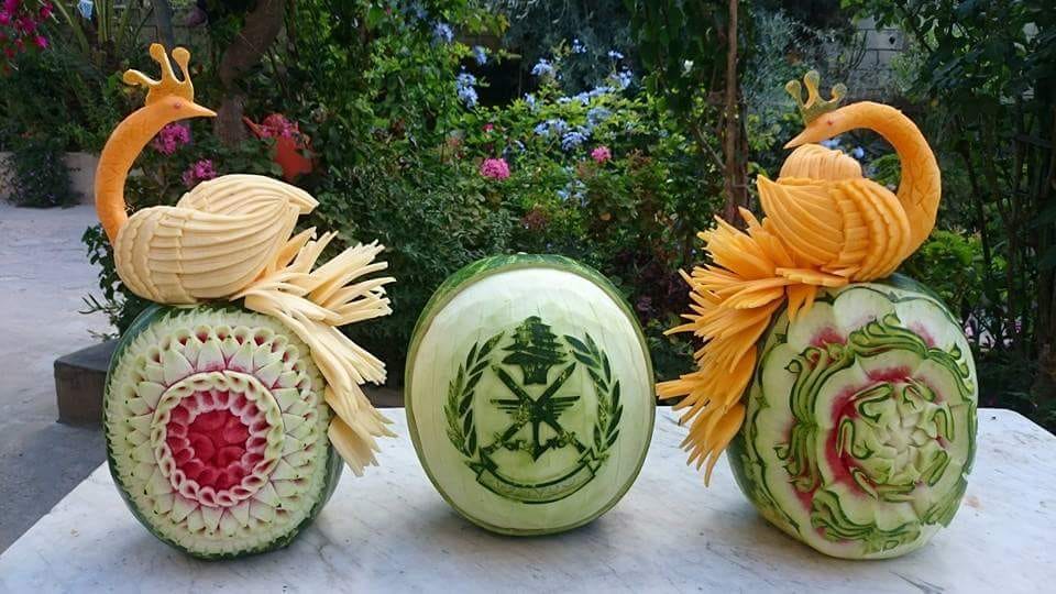 أما لجهة التركيز على البطيخ والشمام واللقطين نظرا” لحجمه الكبير وسماكة القشرة التي تساعد كثيرا في عملية النحت والعدة المستعملة تقتصر على سكين رفيع فقط والموهبة التي من خلالها أتصور الرسمة المطلوبة والتعامل بدقة وتروي دون الأسعجال لأي خطأ في عملية الحفر لا يمكن إصلاحه. والبداية تكون عبر إزالة الزوائد في القطعة المراد الحفر عليها، وقد أضطر أحياناً إلى إجراء عمليات توصيل على سبيل المثال رسمة الجناحين والذنب لطائر النسر. حيث تخضع القطع المنفردة كل على حدا لعملية توصيل دقيقة وفنية في المكان المخصص لها بواسطة عيدان “الكوردون” عبر غرزها بطريقة مخفية بين القطعة الأم لإتمام عملية التوصيل فيما بينها وهناك مدة زمنية لصلاحية أي قطعة لا تتعدى الـ 48 ساعة، شرط وضعها في البراد، ولا توجد أية عقبات تُذكر سوى فقدان بعض الفواكهة في موسم الشتاء ، وقد شاركت بعدة معارض منها في الجامعة اللبنانية واحتفالات ومهرجانات تقيمها بلدية معركة وحصلت على بعض التكريمات من عدة مراجع وجمعيات ونوادي وأهم شهادة حصلت عليها في الشرق الأوسط مع ميدالية ذهبية من جمعية “الأوريكا” خلال المعرض في البيال.