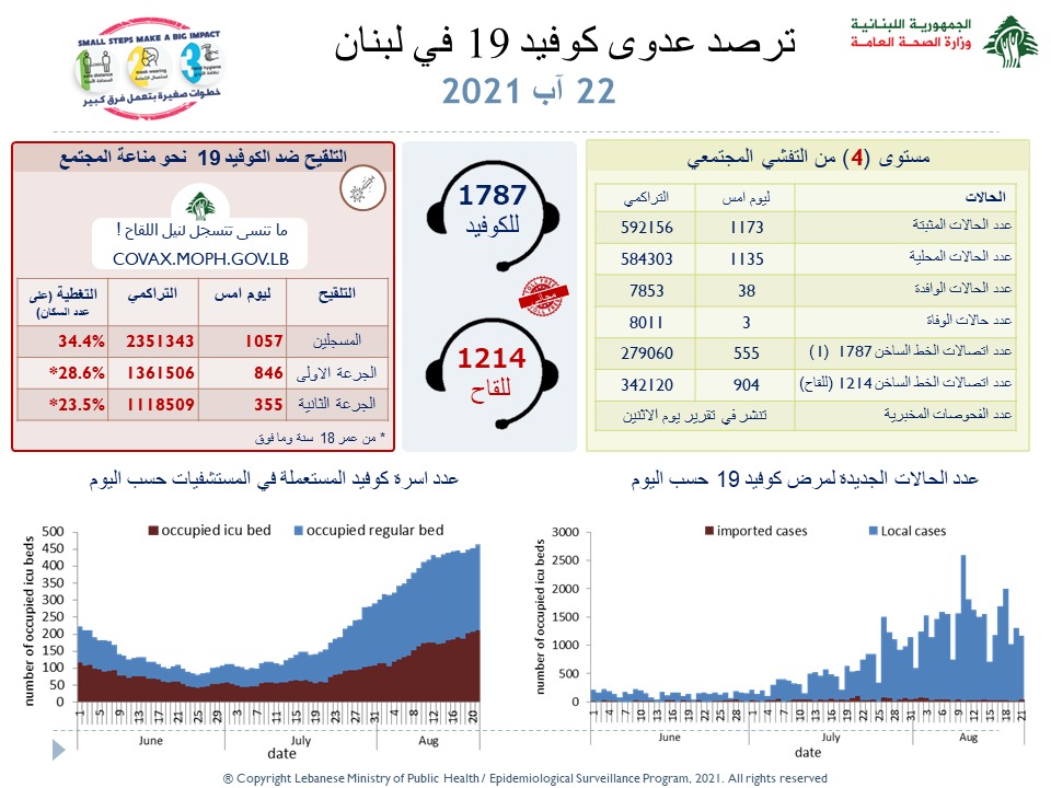 أعلنت وزارة الصحة العامة اللبنانية في تقريرها اليومي تسجيل 1173 إصابة جديدة بفيروس كورونا رفعت العدد التراكمي للحالات المثبتة الى 592156، كما تم تسجيل 3 حالات وفاة.