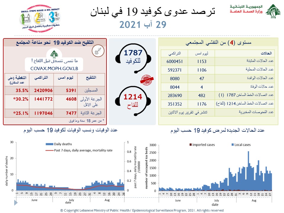 أعلنت وزارة الصحة العامة اللبنانية في تقريرها اليومي تسجيل 1153 إصابة جديدة بفيروس كورونا رفعت العدد التراكمي للحالات المثبتة الى 6000451، كما تم تسجيل 4 حالات وفاة.