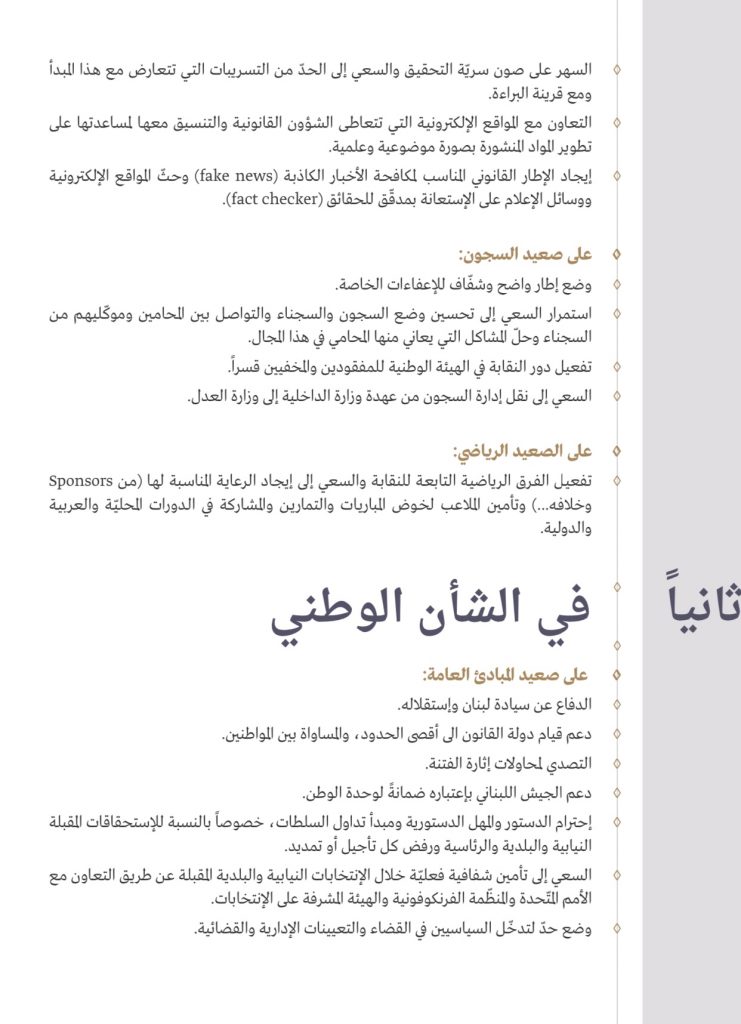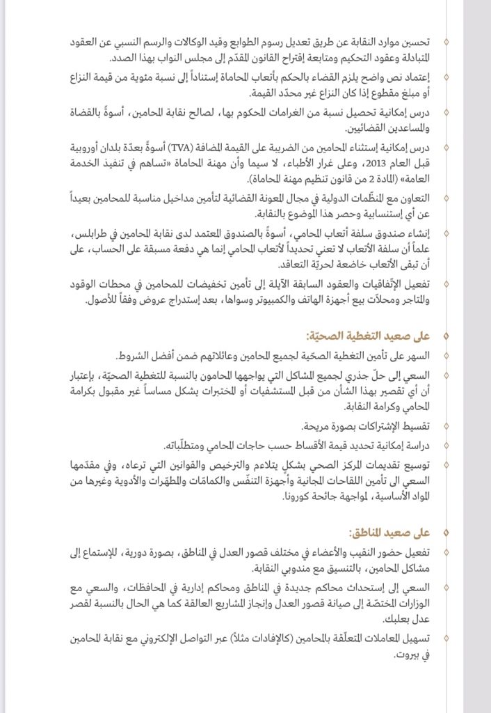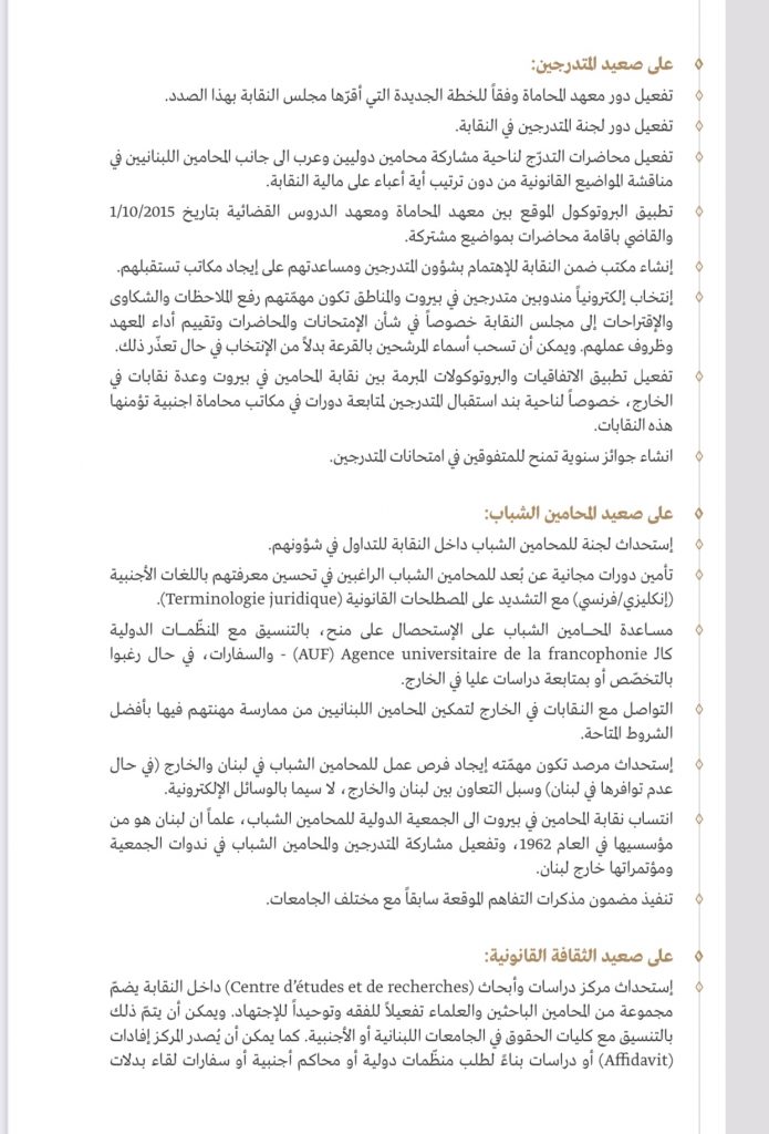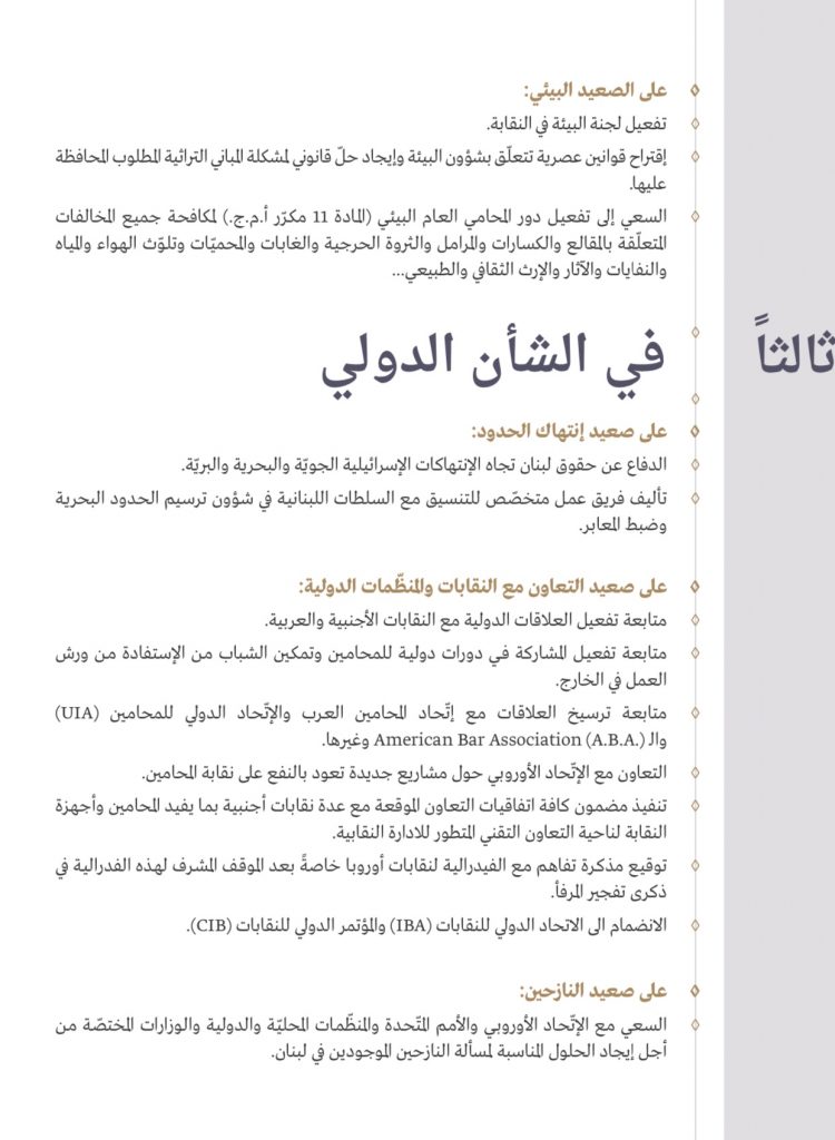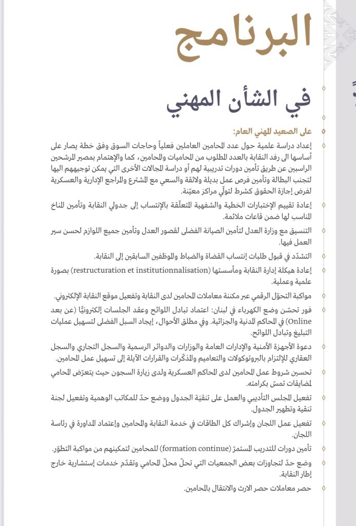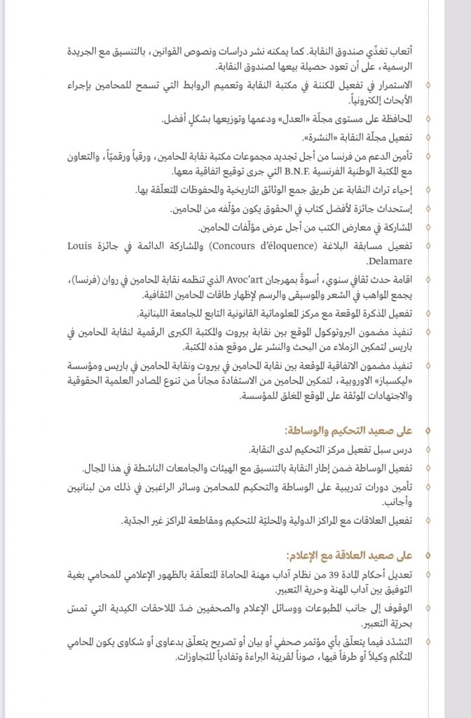 إن الخبرة المهنية و الثقافة و العلاقات الطّيبة مع الزميلات والزملاء تشكل رافعة لتحقيق الأهــداف والنهــوض بأوضــاع المحامين وبشــؤون العدليــة في وقــت يتعــّرض فيــها لقضــاء لشــّتى الضغوطــات والتدّخــلات ولحــالات تمــّرد غير مسبوقة تركــت تشوهات في هيبــة القضــاء ووقــاره. وأســِنُد برنامجــي على قاعدة التعــاون الكامــل والتنسيق التــام والمتواصل مع مجلس النقابة ومع النقباء السابقين ن الذي يغنون النقابة بخبرتهم وآرائهم القيمة.