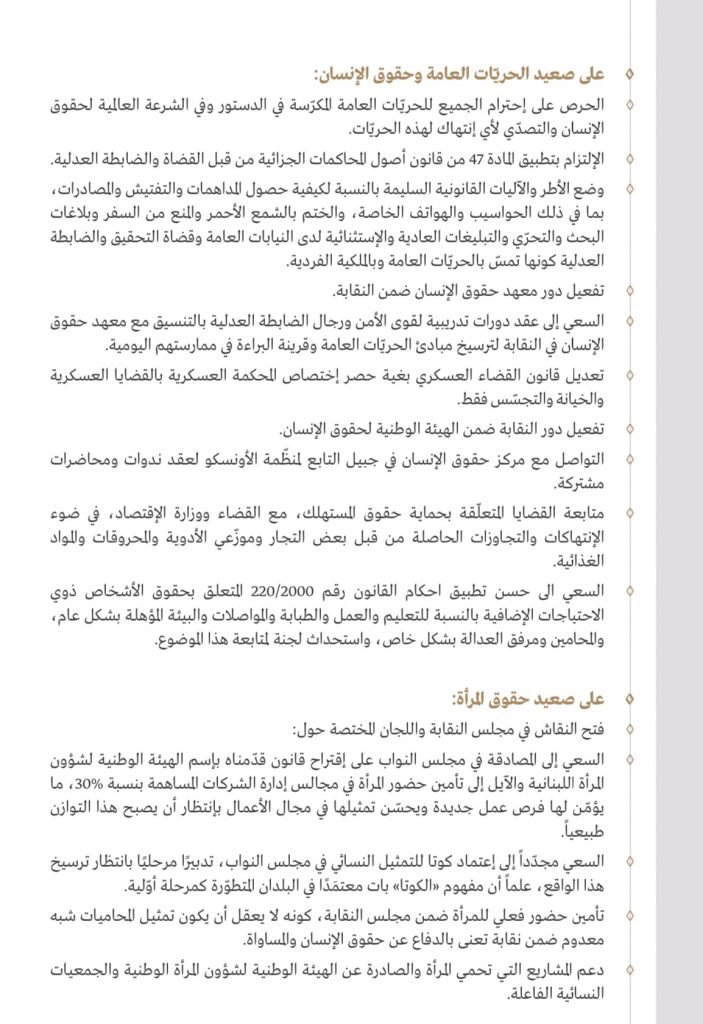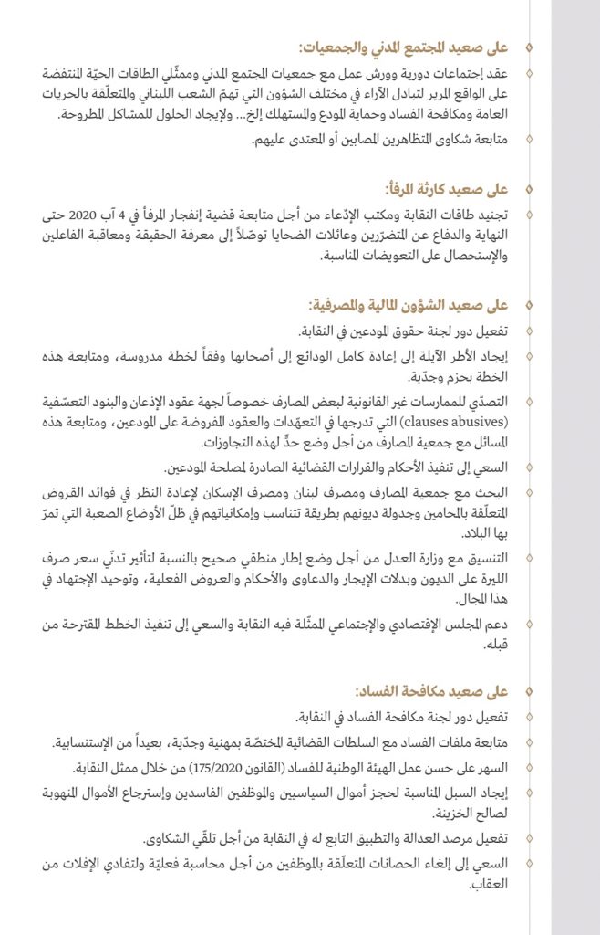 كما يتر تب على نقابــة المحامــن أن تلعــب دوراً وطنيــاً رائــداً فتســهر عــى حســن تطبيــق الدستور والقوانن وحسن سير الإنتخابات النيابية بالشفافية المطلوبة، وتتابع بمسؤولية وطنية ومهنية ـ ملف تفجـيـر مرفــأ بــروت، وملــف استقلالية السلطة القضائية ، وملفــات