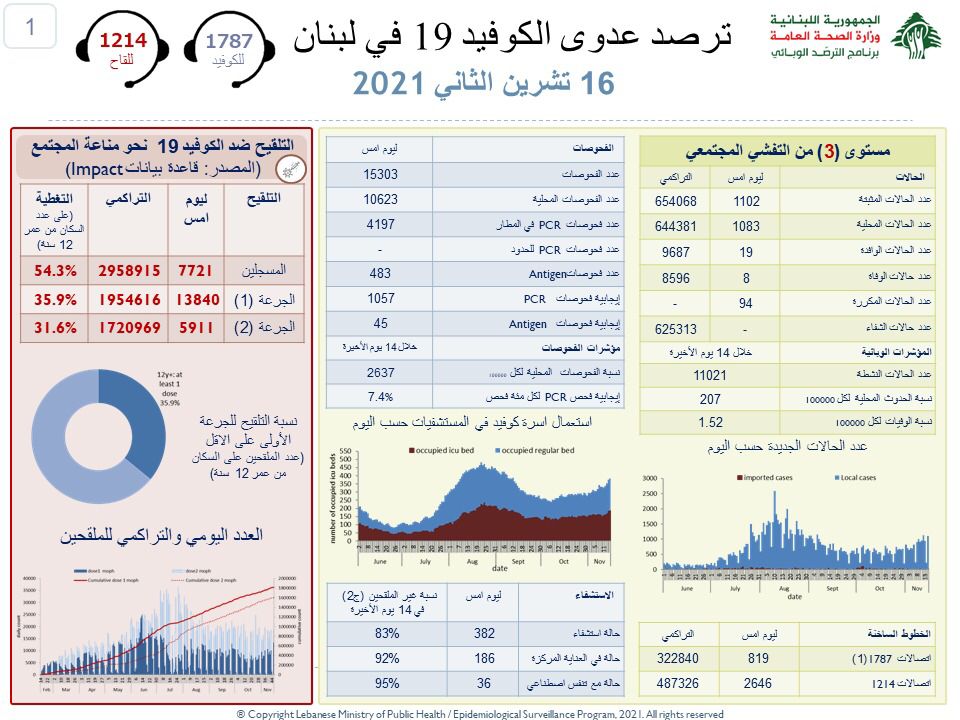 رتفاع مقلق جديد سجله عداد كورونا في لبنان، حيث أعلنت وزارة الصحة العامة في تقريرها اليومي عن 1102 إصابة جديدة إضافةً الى 8 حالات وفاة خلال الساعات الـ24 الماضية.