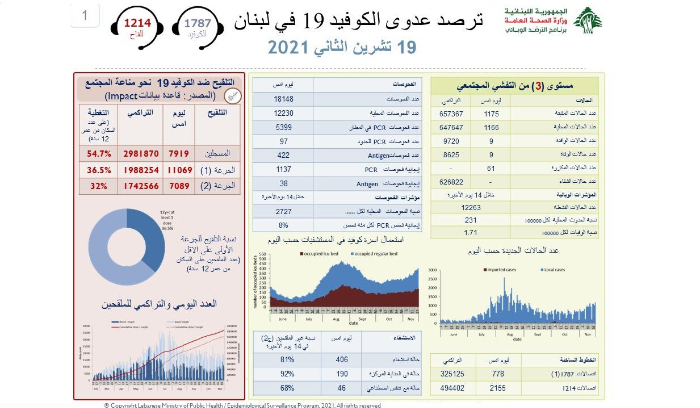 أعلنت وزارة الصحة العامة اللبنانية في تقريرها اليومي تسجيل “1175 إصابة جديدة بفيروس كورونا رفعت العدد التراكمي للحالات المثبتة الى 657367، كما تم تسجيل 9 حالات وفاة”